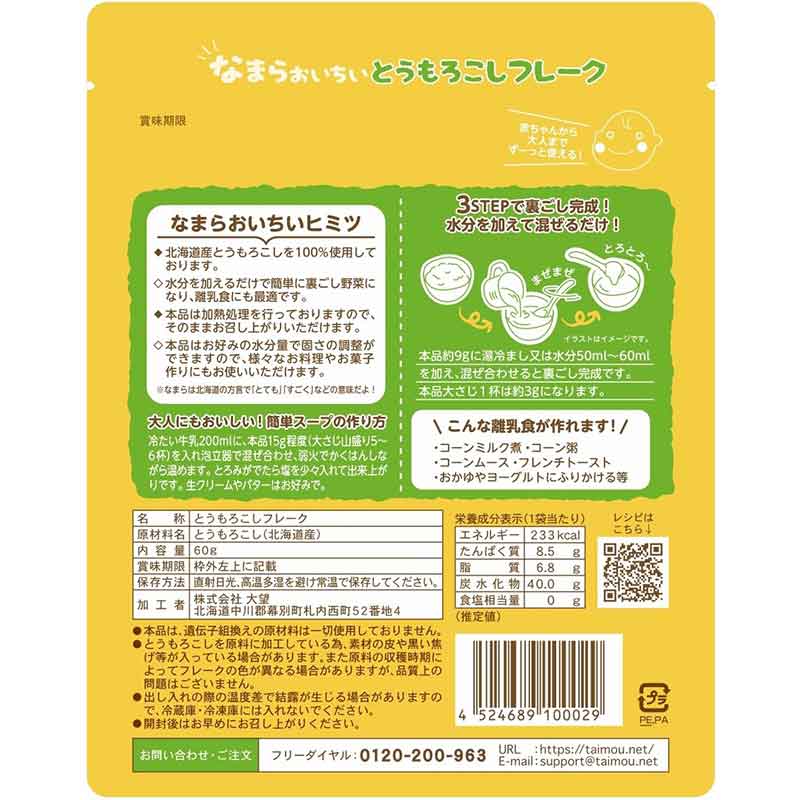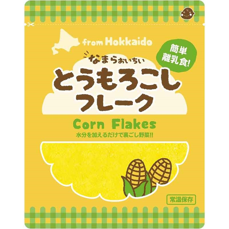 北海道産のとうもろこし100%使用。 北海道の大自然が育んだ風土と農家の汗の結晶が育てた新鮮野菜をそのまま無添加・無着色・保存料を使用せず加工した食品です。 とうもろこしフレークはとうもろこしをボイルし、加熱処理後ドラム乾燥してフレーク状に加工してあります。 フレークはお野菜の栄養を簡単に摂取できますので、野菜不足の方や離乳食・流動食・お料理の材料など幅広くご使用になれます。