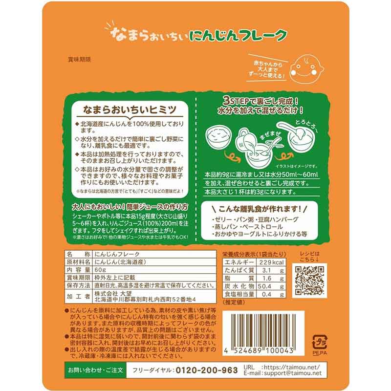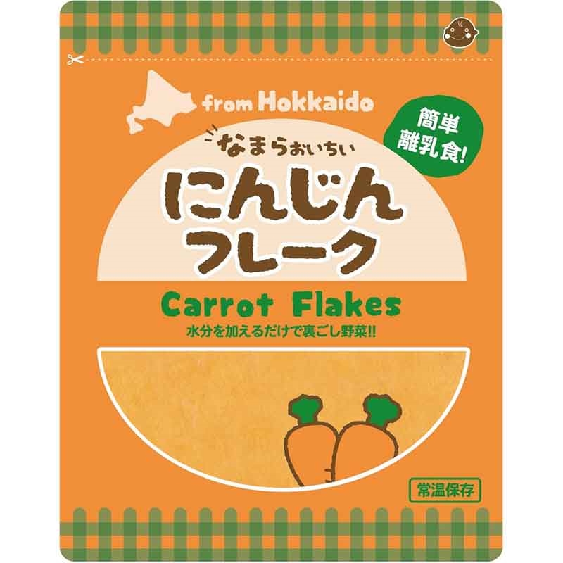 北海道産のにんじん100%使用。 北海道の大自然が育んだ風土と農家の汗の結晶が育てた新鮮野菜をそのまま無添加・無着色・保存料を使用せず加工した食品です。 にんじんフレークはにんじんをボイルし、加熱処理後ドラム乾燥してフレーク状に加工してあります。 フレークはお野菜の栄養を簡単に摂取できますので、野菜不足の方や離乳食・流動食・お料理の材料など幅広くご使用になれます。