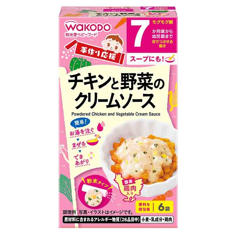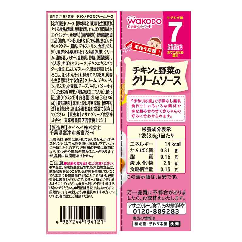 ●対象月齢:7ヵ月~ ●原材料名:乳等を主要原料とする食品(乳糖、脱脂粉乳、たんぱく質濃縮ホエイパウダー、全粉乳)(国内製造)、乾燥鶏肉加工品(鶏肉、パン粉、たまねぎ、でん粉、食塩)、チキンパウダー(鶏肉、デキストリン、食塩、でん粉)、乳等を主要原料とする食品(乳糖、クリーム、濃縮乳、バター、全粉乳、砂糖、脱脂粉乳)、でん粉、かぼちゃフレーク、チキンエキスパウダー、食塩、にんじんフレーク、乾燥野菜(とうもろこし、ほうれんそう)、酵母エキス粉末、乳等を主要原料とする食品(クリーム、デキストリン、でん粉、小麦粉、チーズ、牛乳、バターオイル)、たまねぎ粉末/増粘剤(加工でん粉)、酸化防止剤(ビタミンE) ●内容量:21.6g(3.6g×6袋) ●栄養成分:単位重量 1袋(3.6g)当たり エネルギー 14kcal たんぱく質 0.31g 脂質 0.16g 炭水化物 2.8g 食塩相当量 0.15g