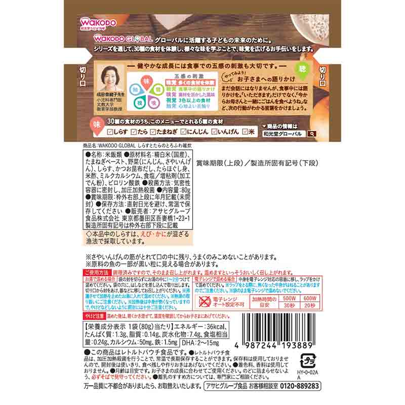 グローバルに活躍する子どもの未来のために。 シリーズを通して、30種の食材を体験し、様々な味を学ぶことで、味覚を広げるお手伝いをします。 釜揚げしらす、たらと3種の野菜をかつお昆布だしで煮込んだ、やさしい風味の雑炊です。 お米はコシヒカリを使用しています。 国産野菜使用。 鉄、カルシウム、魚由来のDHA配合。 ※パッケージデザインが、画像と異なる場合がございます。