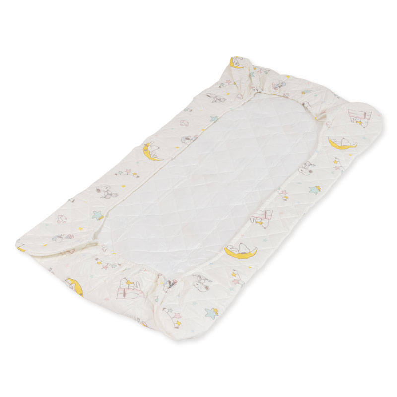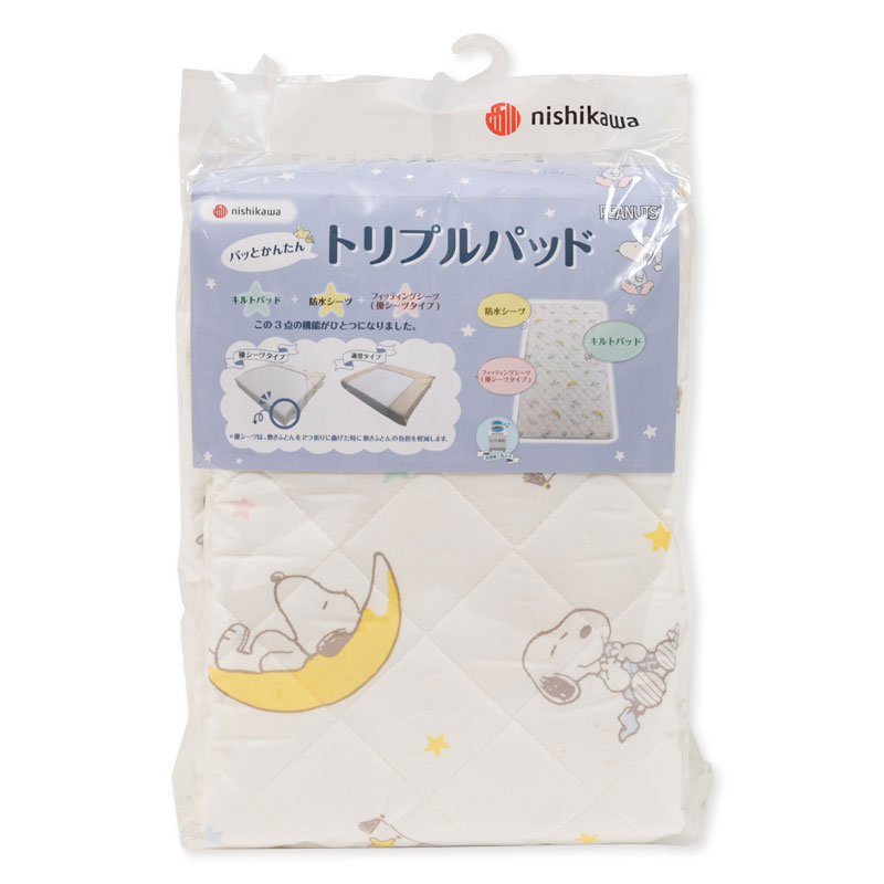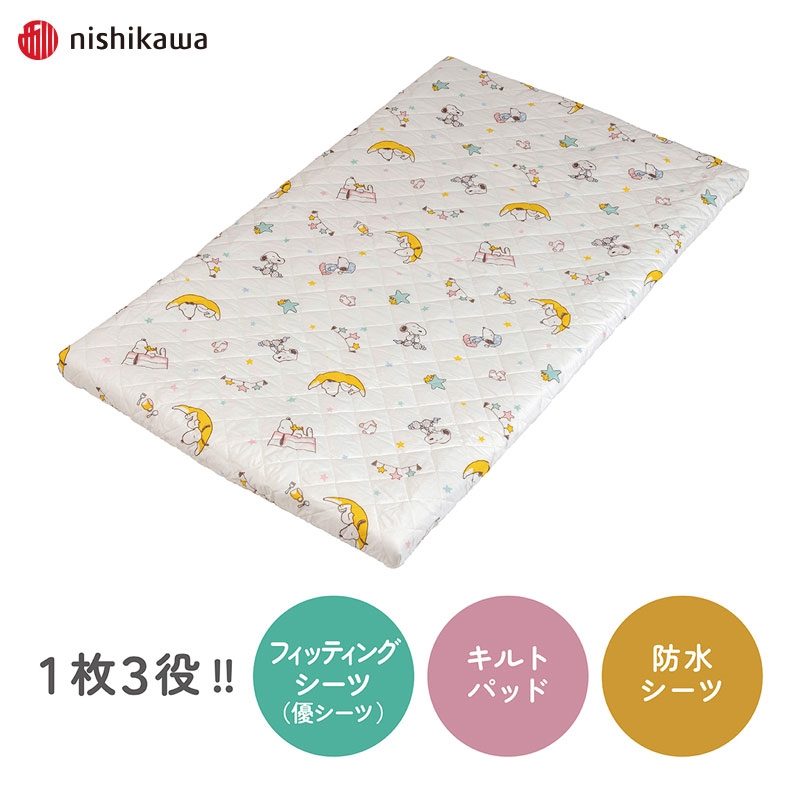 防水シーツ・キルトパッド・フィッティングシーツの3つの機能がひとつになりました。 付け替えの手間が省けてラクチン。 かわいいスヌーピー柄です。 裏面ゴムは、二つに折りたたんでも敷きふとんが傷みにくいシーツの仕様。 汚れても、洗濯機OK(ネット使用)です。