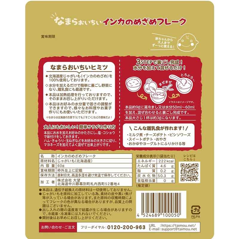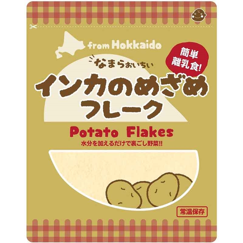 ●北海道産のインカのめざめ100%使用。 ●北海道の大自然が育んだ風土と農家の汗の結晶が育てた新鮮野菜をそのまま無添加・無着色・保存料を使用せず加工した食品です。 インカのめざめフレークはインカのめざめをボイルし、加熱処理後ドラム乾燥してフレーク状に加工してあります。 フレークはお野菜の栄養を簡単に摂取できますので、野菜不足の方や離乳食・流動食・お料理の材料など幅広くご使用になれます。
