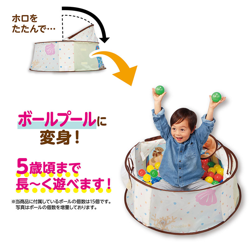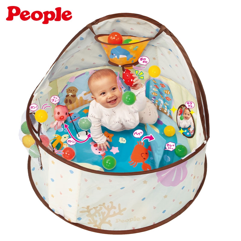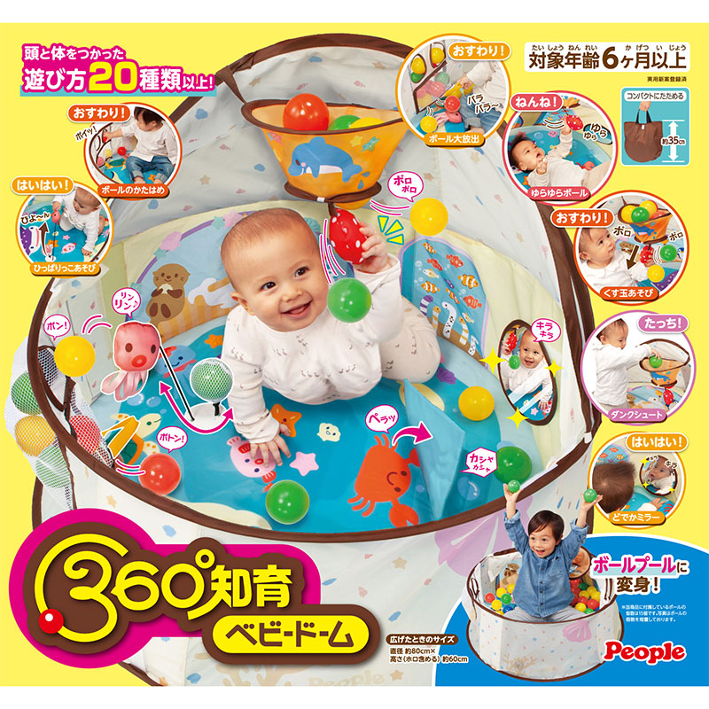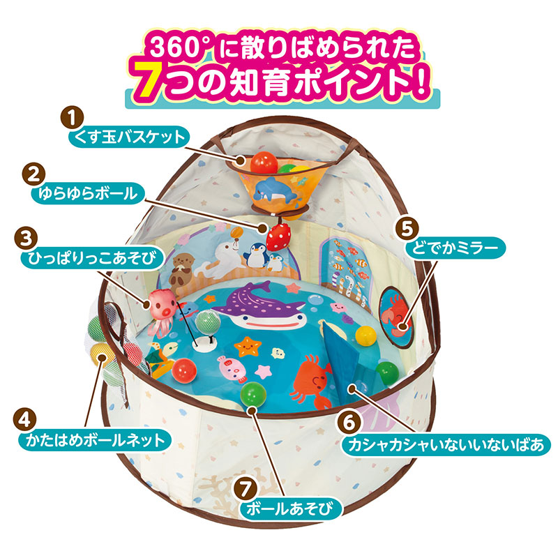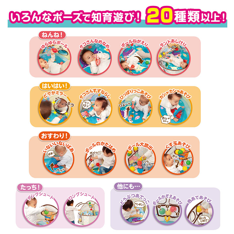 寝返りし始めた赤ちゃんの居場所にピッタリ。 ドームテントの中にはぐるりとオモチャが付いて、遊び方20種類以上。 大きくなったらボールプールとしても長く遊べます。 頭と体をつかった遊び方20種類以上。 ねんね:ゆらゆらボール はいはい:ひっぱりっこ遊び たっち:ダンクシュート おすわり:ボールのかたはめ