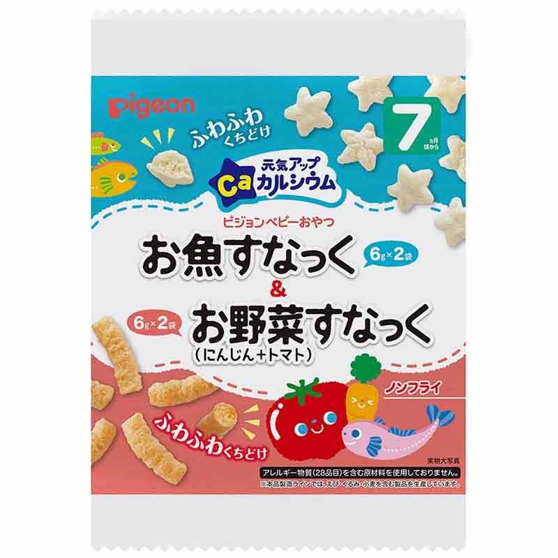 ●元気アップカルシウム お魚すなっく&お野菜すなっく にんじん+トマト ●原材料名: お魚すなっく うるち米(国産)、いわし粉末、食塩、食用油脂/炭酸カルシウム お野菜すなっく コーングリッツ(国内製造)、うるち米(国産)、野菜粉末(にんじん、トマト)、食塩、食用油脂、砂糖/炭酸カルシウム ●内容量: お魚すなっく12g(6g×2袋) お野菜すなっく12g(6g×2袋)
