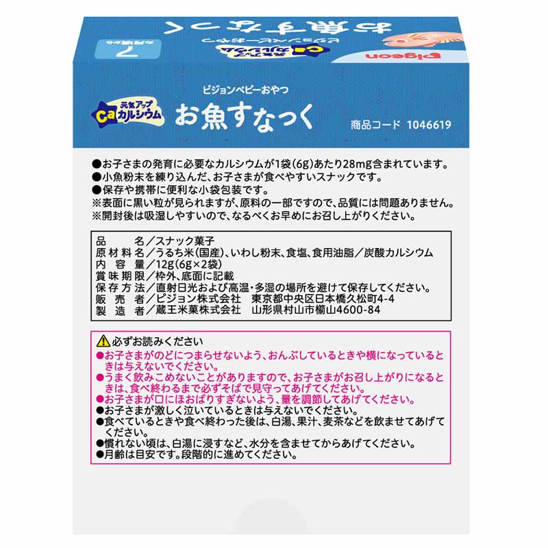 ●元気アップカルシウム お魚すなっく ●原材料名:うるち米(国産)、いわし粉末、食塩、食用油脂/炭酸カルシウム ●内容量:12g(6g×2袋)