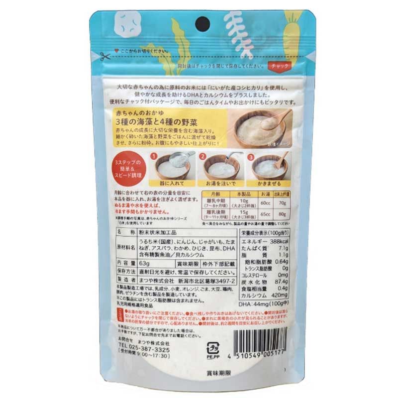●3種類の海藻(わかめ、ひじき、昆布)と4種の野菜(にんじん、じゃがいも、たまねぎ、アスパラガス)を配合。 新潟産コシヒカリ使用。アレルゲン28品目不使用。 健やかな成長を助けるDHAと貝カルシム入り。 お湯を注いで混ぜるだけ。簡単調理。お出かけ先でもラクラク。 開封後はチャックを閉じて保存できます。 ●63g