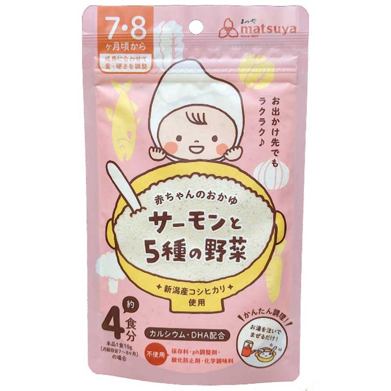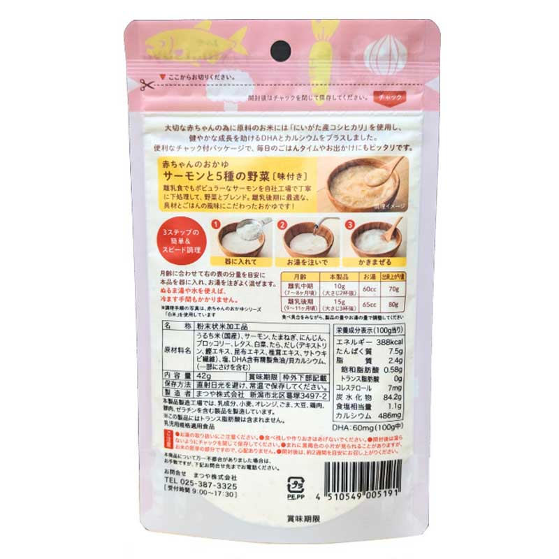 新潟産コシヒカリが主原料の粉末状おかゆ。 本製品をお湯または水で混ぜるだけで裏ごしなどの手間をかけず、簡単にサーモンと野菜入りのおかゆが作れます。 水分量でやわらかさも自在に調整できます。 化学調味料、香料、保存料なども不使用。 和風だしでほんのり味付けしました。7・8カ月頃から ※パッケージデザインが、画像と異なる場合がございます。