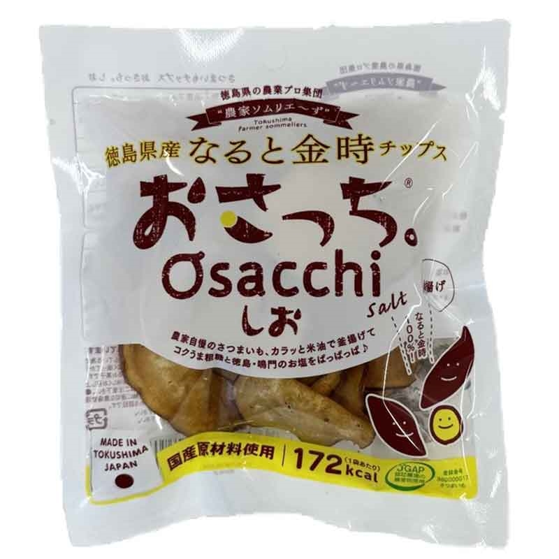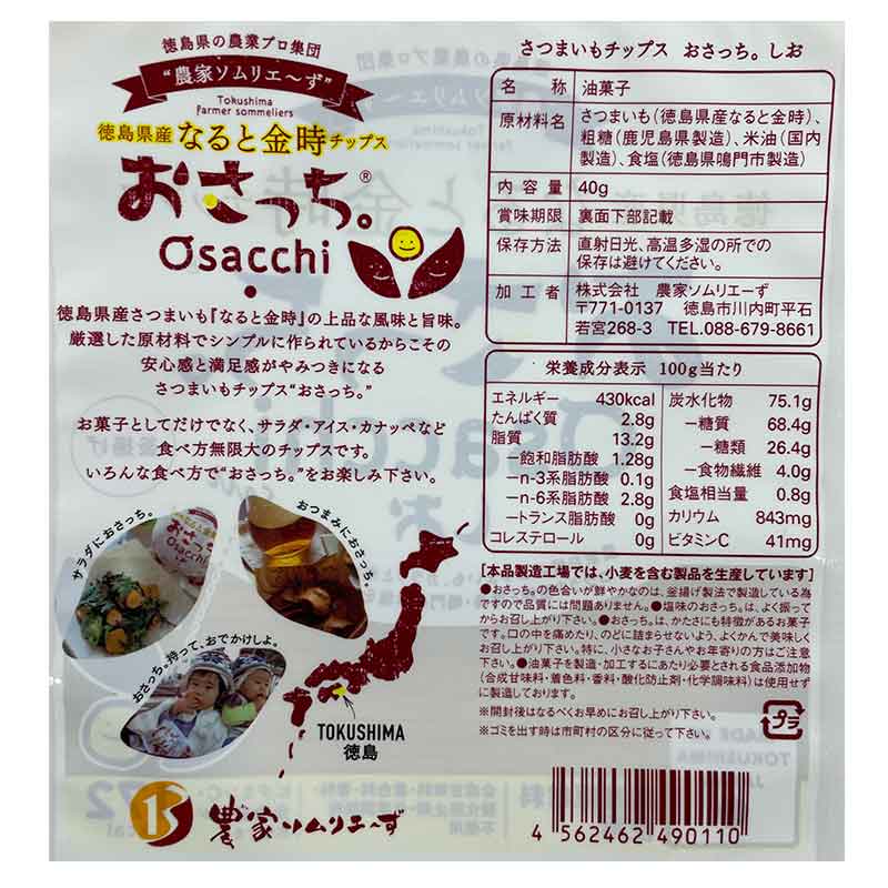 ●油菓子 ●原材料名:さつまいも(徳島県産なると金時)、粗糖(鹿児島県製造)、米油(国内製造)、食塩(徳島県鳴門市製造) ●内容量:40g ●栄養成分:100gあたり 熱量 430kcal たんぱく質 2.8g 脂質 13.2g 炭水化物 75.1g 食塩相当量 0.8g 飽和脂肪酸 1.28g nー3系脂肪酸 0.1g nー6系脂肪酸 2.8g トランス脂肪酸 0g コレステロール 0g 糖質 68.4g 糖類 26.4g 食物繊維 4.0g カリウム 843mg ビタミンC 41mg
