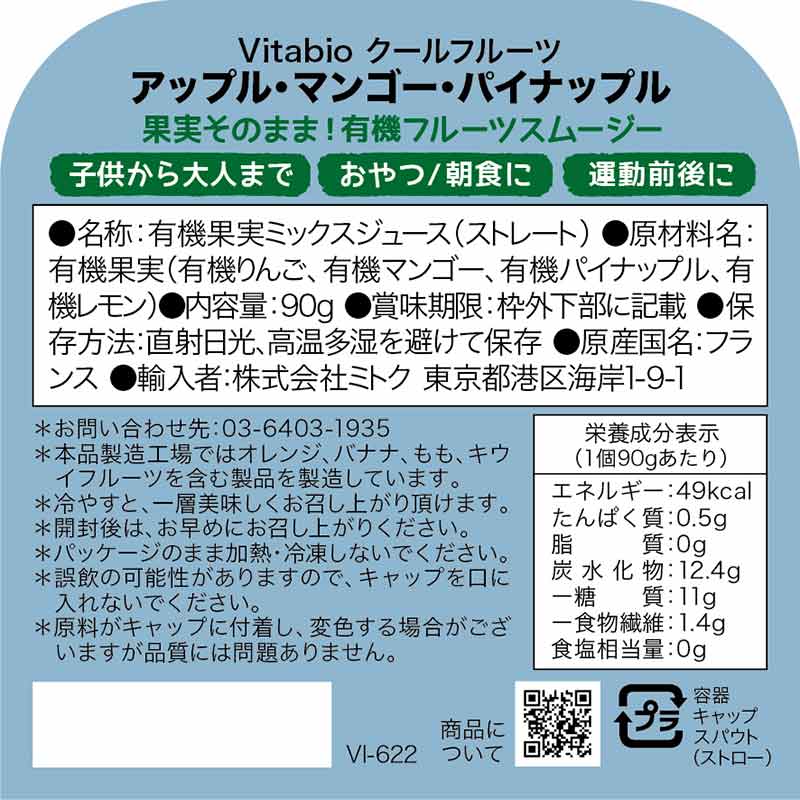 有機栽培されたフルーツの果汁だけを使った、スムージータイプのとろみがあるドリンクです。 南国の香り豊かなマンゴーとパイナップルの甘酸っぱさが口の中で広がります。 キャップを開けてそのままお召し上がり下さい。 冷やすと一層美味しくお飲み頂けます。 朝食・おやつ・食欲のない時に。 お子様のお出かけのお供に。