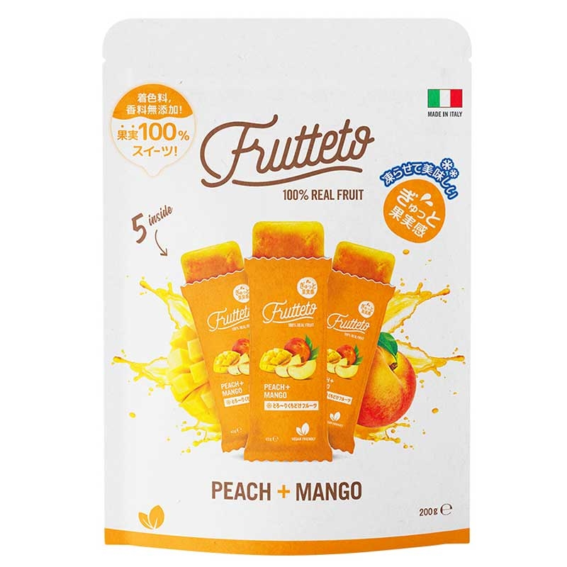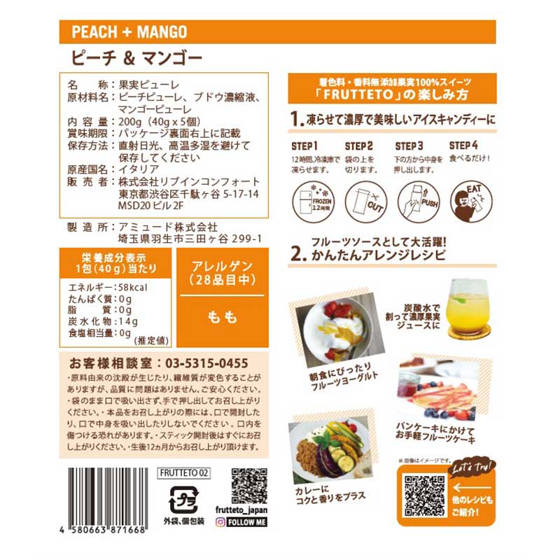●アイスキャンディ ●原材料名:ピーチピューレ、ブドウ濃縮液、マンゴーピューレ ●内容量:40g×5本