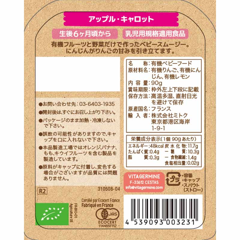 有機果実と有機野菜をすり潰したスムージータイプのベビーフードです。 クセのない人参がりんごの甘みを引き立てます。 生後6カ月頃よりお召し上がり頂けます。 乳児用規格適用食品です。 開封後はすぐにお召し上がり下さい。 Babybio(ベビービオ)は、フランスで最初にオーガニック ベビーミルクを開発した ブランドです。 必要のない添加物は一切加えず、高品質の有機食材から作られた幼児向けの食品を提供しています。 フランスを中心に、近隣のヨーロッパ諸国で収穫した原材料を使用しています。 主原料のりんごは、フランス南西部アキテーヌ地方産を使用しています。 この地方のりんごは、栽培に適した気候・地質に恵まれており、甘くジューシーでサクサクとした食感が楽しめます。 商品パッケージは、リサイクルが可能にするなど、環境に配慮した製品作りをおこなっています。