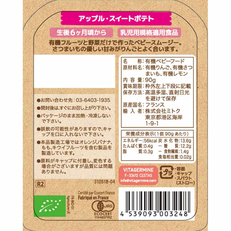 有機果実と有機野菜をすり潰したスムージータイプのベビーフードです。 さつまいもの優しい甘みがりんごとよく合います。 生後6カ月頃よりお召し上がり頂けます。 乳児用規格適用食品です。 開封後はすぐにお召し上がり下さい。 Babybio(ベビービオ)は、フランスで最初にオーガニック ベビーミルクを開発した ブランドです。 必要のない添加物は一切加えず、高品質の有機食材から作られた幼児向けの食品を提供しています。 フランスを中心に、近隣のヨーロッパ諸国で収穫した原材料を使用しています。 主原料のりんごは、フランス南西部アキテーヌ地方産を使用しています。 この地方のりんごは、栽培に適した気候・地質に恵まれており、甘くジューシーでサクサクとした食感が楽しめます。 商品パッケージは、リサイクルが可能にするなど、環境に配慮した製品作りをおこなっています。