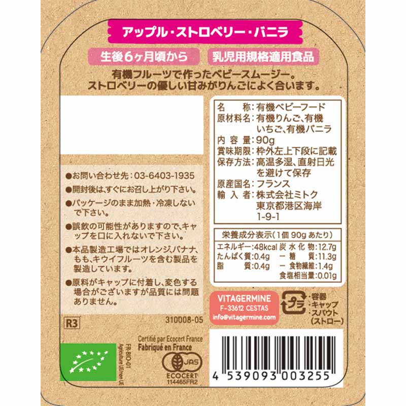 有機果実をすり潰したスムージータイプのベビーフードです。 ストロベリーの優しい甘みが、りんごによく合います。 生後6カ月頃よりお召し上がり頂けます。 乳児用規格適用食品です。 開封後はすぐにお召し上がり下さい。 Babybio(ベビービオ)は、フランスで最初にオーガニック ベビーミルクを開発した ブランドです。 必要のない添加物は一切加えず、高品質の有機食材から作られた幼児向けの食品を提供しています。 フランスを中心に、近隣のヨーロッパ諸国で収穫した原材料を使用しています。 主原料のりんごは、フランス南西部アキテーヌ地方産を使用しています。 この地方のりんごは、栽培に適した気候・地質に恵まれており、甘くジューシーでサクサクとした食感が楽しめます。 商品パッケージは、リサイクルが可能にするなど、環境に配慮した製品作りをおこなっています。
