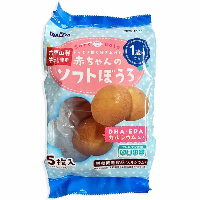 六甲山麓牛乳を使用し、しっとり甘く焼き上げた、カルシウム入りの栄養機能食品のお菓子です。 さらに赤ちゃんにとって大切な栄養素であるDHA(ドコサヘキサエン酸)とEPA(エイコサペンタエン酸)をプラス。 2枚当たりDHA16mg、EPA3mg含まれています。