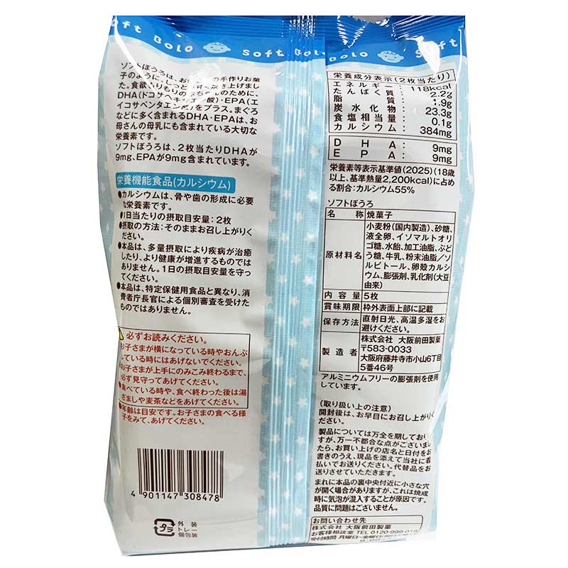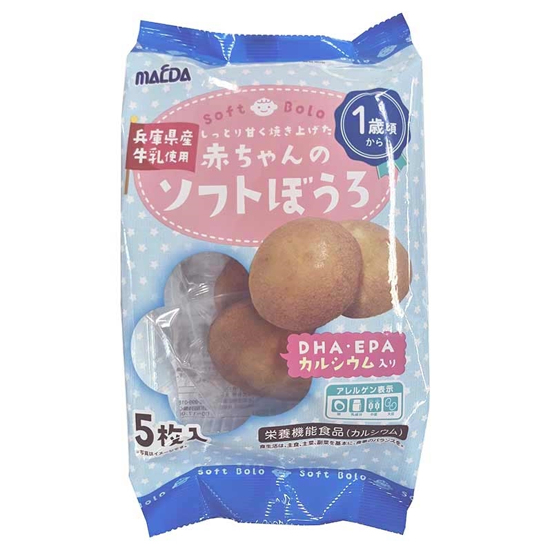 兵庫県産牛乳を使用し、しっとり甘く焼き上げた、カルシウム入りの栄養機能食品のお菓子です。 さらに赤ちゃんにとって大切な栄養素であるDHA(ドコサヘキサエン酸)とEPA(エイコサペンタエン酸)をプラス。 2枚当たりDHAが9mg、EPAが9mg含まれています。