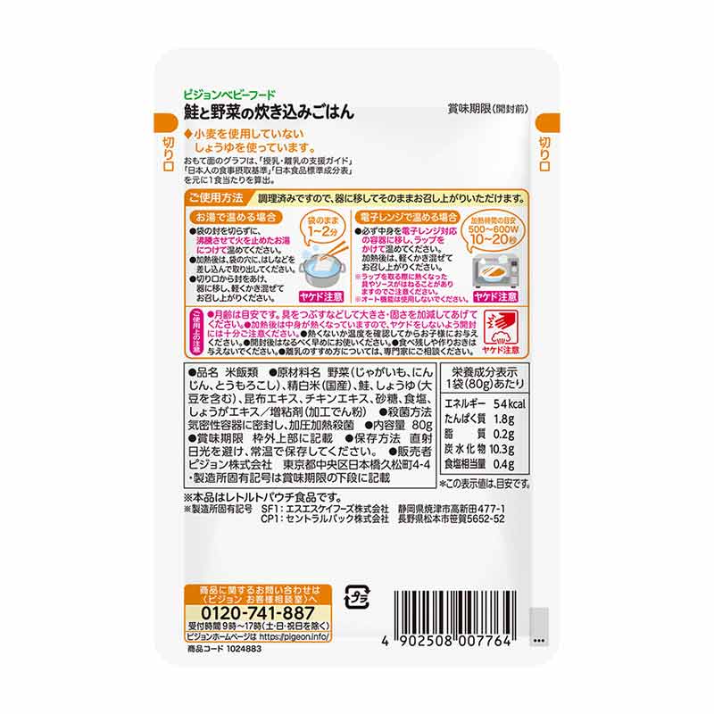 レーダーチャートが付いているので栄養バランスが一目でわかる管理栄養士のこだわりレシピ たんぱく質アイコンでメニュー選びをサポートします 食育レシピの特徴 ●たっぷり野菜と鮭の風味豊かな炊き込みごはんです。 ●12ヵ月頃からの赤ちゃんのかむ力の発達に合わせて、具材の大きさや固さを調整しています。 ●着色料、香料、保存料は使用しておりません。 ●小麦を使用していないしょうゆを使っています。 ●内容量 80 g