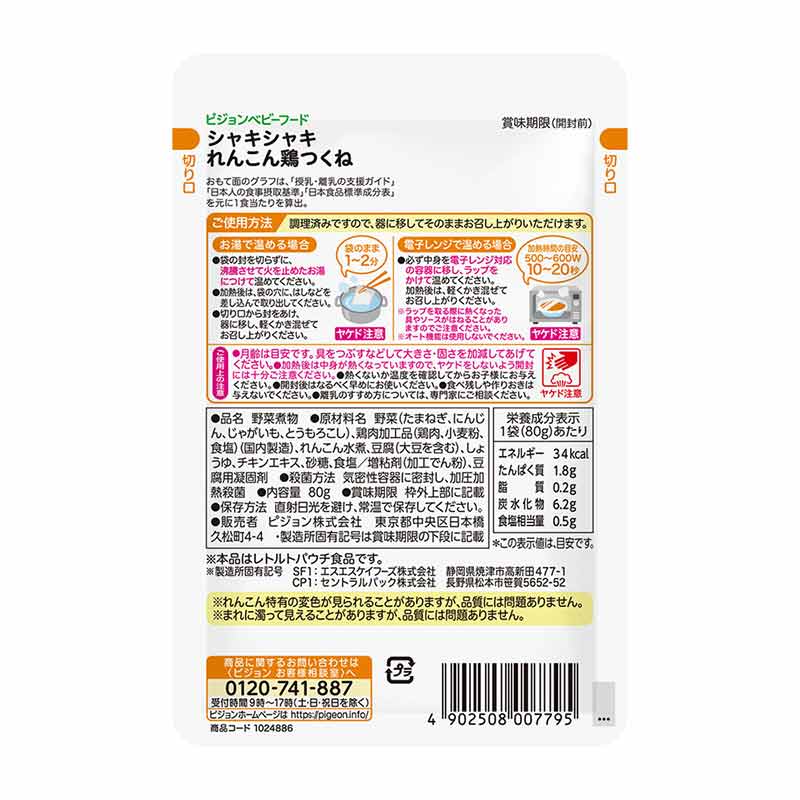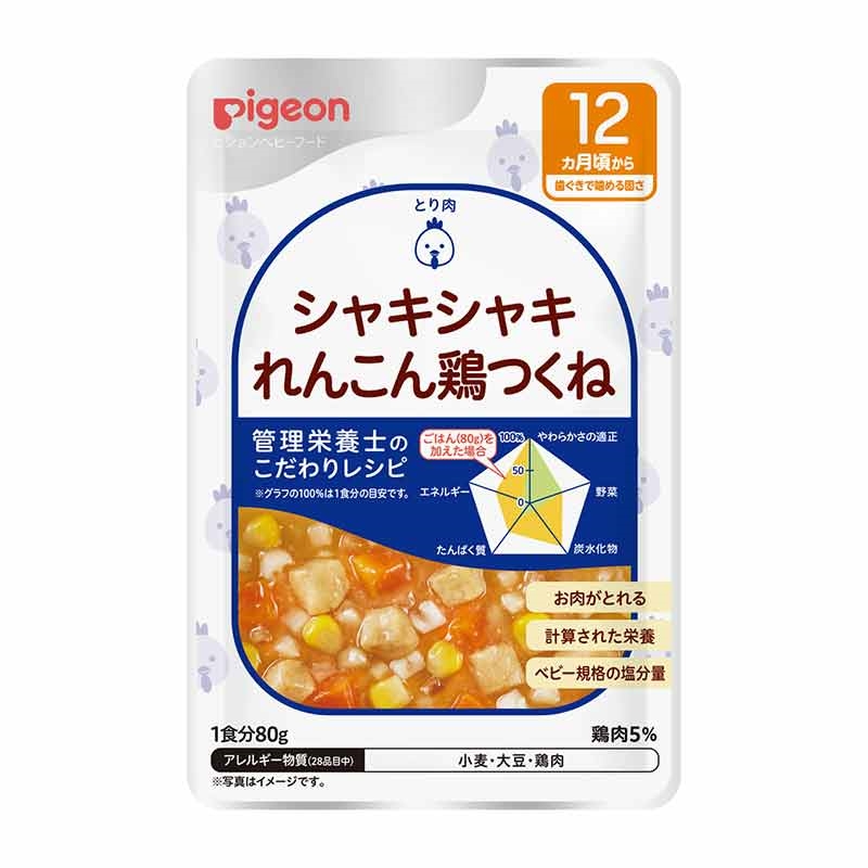 レーダーチャートが付いているので栄養バランスが一目でわかる管理栄養士のこだわりレシピ たんぱく質アイコンでメニュー選びをサポートします 食育レシピの特徴 ●ふんわり鶏つくねとシャキシャキれんこんの食感が楽しめます。 ●12ヵ月頃からの赤ちゃんのかむ力の発達に合わせて、具材の大きさや固さを調整しています。 ●着色料、香料、保存料は使用しておりません。 ●内容量 80 g