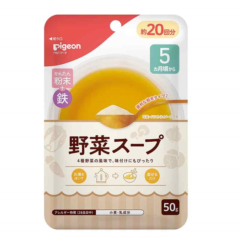 かんたん粉末+鉄の特徴 ●4 種類の野菜風味でおいしく仕上げた、うす味のスープです。 ●1回分でほうれん草2.89g分の鉄分が取れます。 (*日本食品標準成分表(2020年)ほうれん草の葉、通年平均、ゆでの値) ●5ヵ月頃から離乳完了(18ヵ月頃)まで幅広くご使用いただけます。 ●着色料、保存料、香料、化学調味料は使用しておりません。 ●さっと溶ける粉末タイプ ●保存に便利なジッパー付き ●内容量:50g(1人45mlで20人分)
