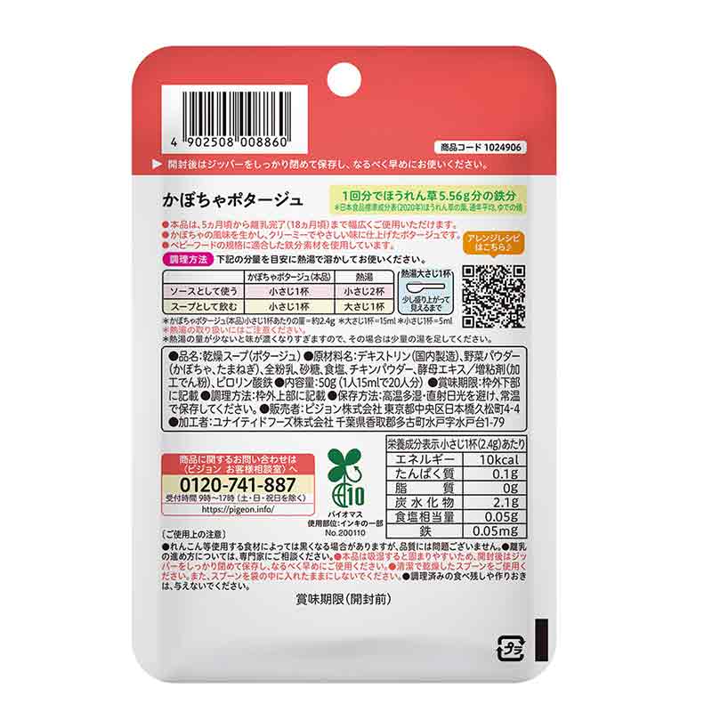 かんたん粉末+鉄の特徴 ●かぼちゃの風味を生かし、クリーミーでやさしい味に仕上げたポタージュです。 ●1回分でほうれん草5.56g分の鉄分が取れます。 (*日本食品標準成分表(2020年)ほうれん草の葉、通年平均、ゆでの値) ●5ヵ月頃から離乳完了(18ヵ月頃)まで幅広くご使用いただけます。 ●着色料、保存料、香料、化学調味料は使用しておりません。 ●さっと溶ける粉末タイプ ●保存に便利なジッパー付き ●内容量:50g( 1人15mlで20人分)