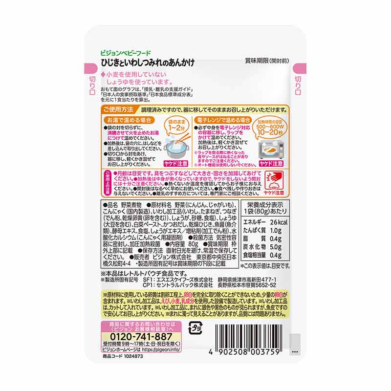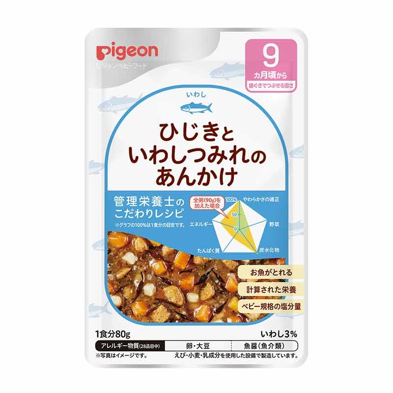 レーダーチャートが付いているので栄養バランスが一目でわかる管理栄養士のこだわりレシピ たんぱく質アイコンでメニュー選びをサポートします 食育レシピの特徴 ●だしのうま味がしみこんだ食べやすいふんわりつみれです。 ●9ヵ月頃からの赤ちゃんのかむ力の発達に合わせて、具材の大きさや固さを調整しています。 ●着色料、香料、保存料は使用しておりません。 ●小麦を使用していないしょうゆを使っています。 ●内容量 80 g