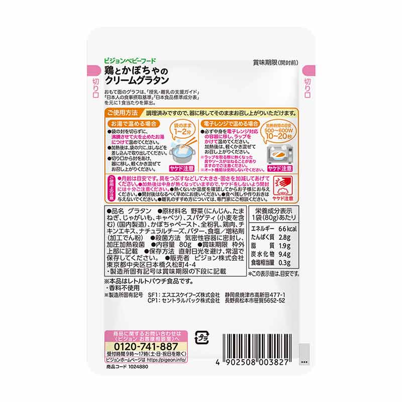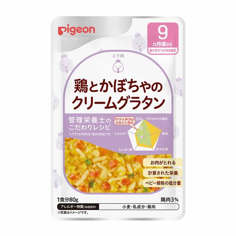 レーダーチャートが付いているので栄養バランスが一目でわかる管理栄養士のこだわりレシピ たんぱく質アイコンでメニュー選びをサポートします 食育レシピの特徴 ●かぼちゃの甘さがやさしい風味豊かなクリーミーグラタンです。 ●9ヵ月頃からの赤ちゃんのかむ力の発達に合わせて、具材の大きさや固さを調整しています。 ●着色料、香料、保存料は使用しておりません。 ●内容量 80 g