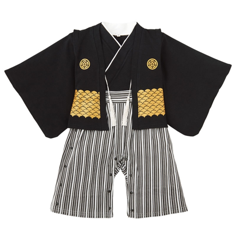 羽織とカバーオールがセットになった男児袴オールです。 袴は左サイドと股下が開き仕様なので着脱がかんたんです。 羽織は前身に房飾り付き。 節句や誕生日などのイベントや年賀状の撮影などに活躍するアイテムです。 ふだんは着ないアイテムなので、お子様の気分もアップ間違いなし。 ※実際の商品と画像は若干異なる場合がございます。
