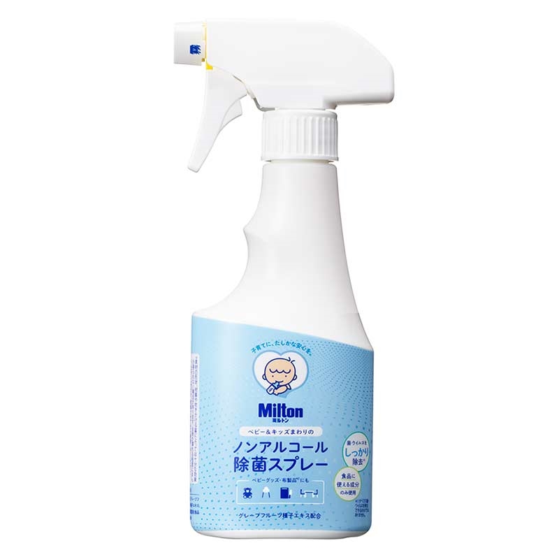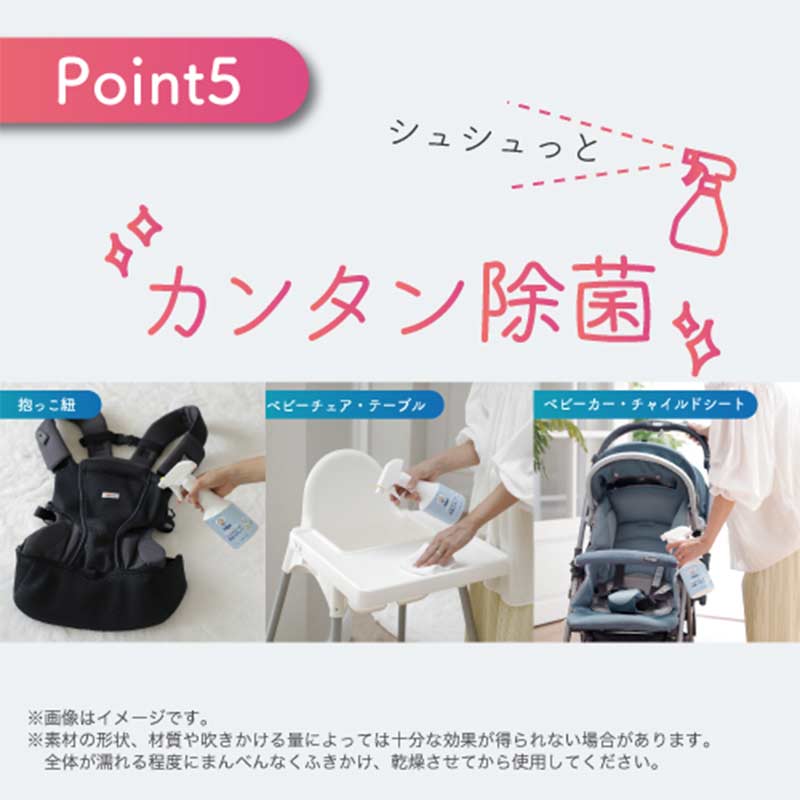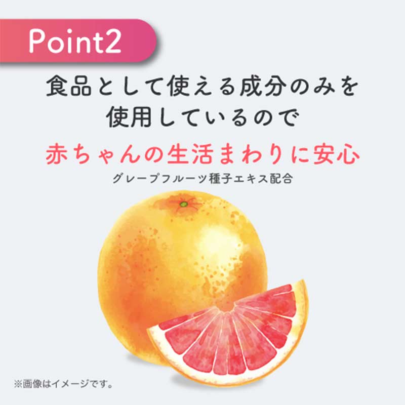 ●ノンアルコールなので赤ちゃんやお子様まわり、アルコールが苦手な方でもお使いいただけます。 ※100%食品成分 ●ベビーカー、ベビーチェア、ぬいぐるみ、おもちゃ、キッチンまわりなどをかんたんに除菌できます。 ※使用できない素材もあります。使用上の注意をよく読んでお使いください。 ●グレープフルーツ種子エキスの力で菌・ウイルスをしっかり除去。 ●乾いたあともグレープフルーツ種子エキスがその場に留まり、あとから付着した菌も抑制します。 ※すべての菌・ウイルスを除去できるわけではありません。