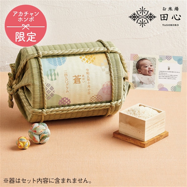 い草で作った米俵に赤ちゃんと同じ重さの新潟県奥阿賀産コシヒカリを詰めました。 ※お届けにはご注文から約2週間かかります。 ※手付袋はお付けできません。