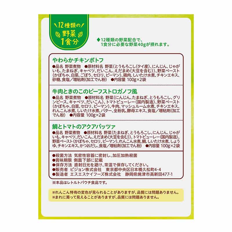 12種類の野菜1食分がとれる野菜シリーズです。 レーダーチャートが付いているので栄養バランスが一目でわかります。 たんぱく質アイコンでメニュー選びをサポート 食育レシピ野菜の特徴 ●12種類の野菜配合で、1食分に必要な野菜40gが摂れます。 ●12ヵ月頃からの赤ちゃんのかむ力の発達に合わせて、具材の大きさや固さを考えて調理しました。 ●着色料、香料、保存料は使用していません。 ●内容量 100g