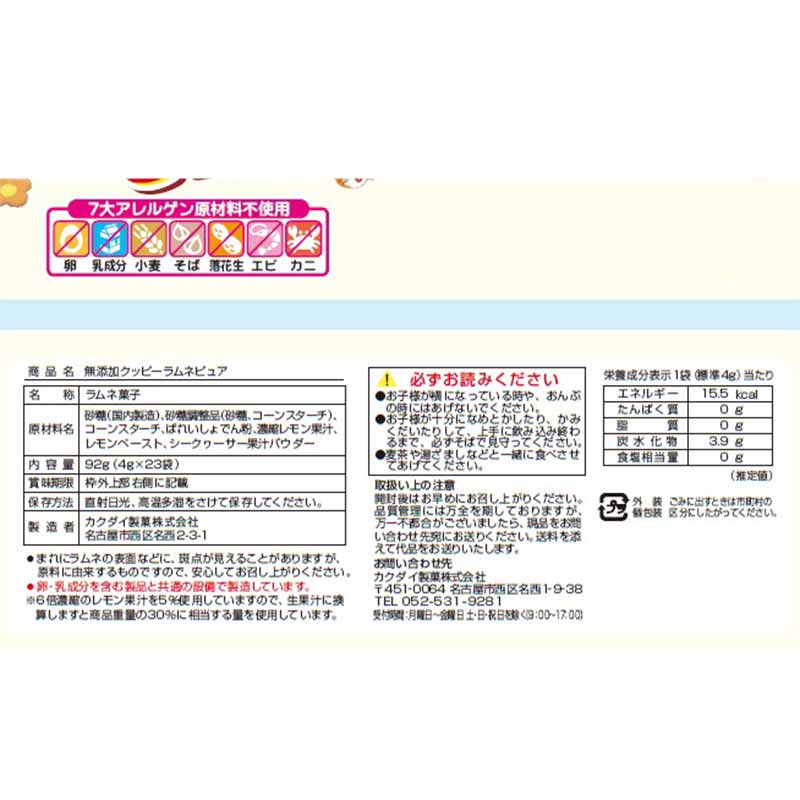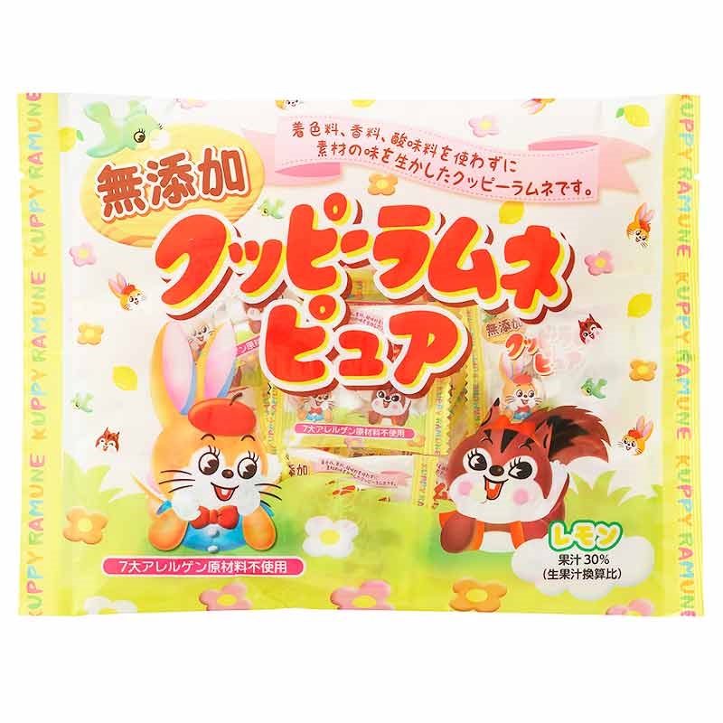 レモン果汁を使用したほんのり甘酸っぱいレモン味のラムネが個包装に入った食べきりサイズです。 個包装に入っているので、家族や友達と分け合えるクッピーラムネです。 7大アレルゲン不使用。