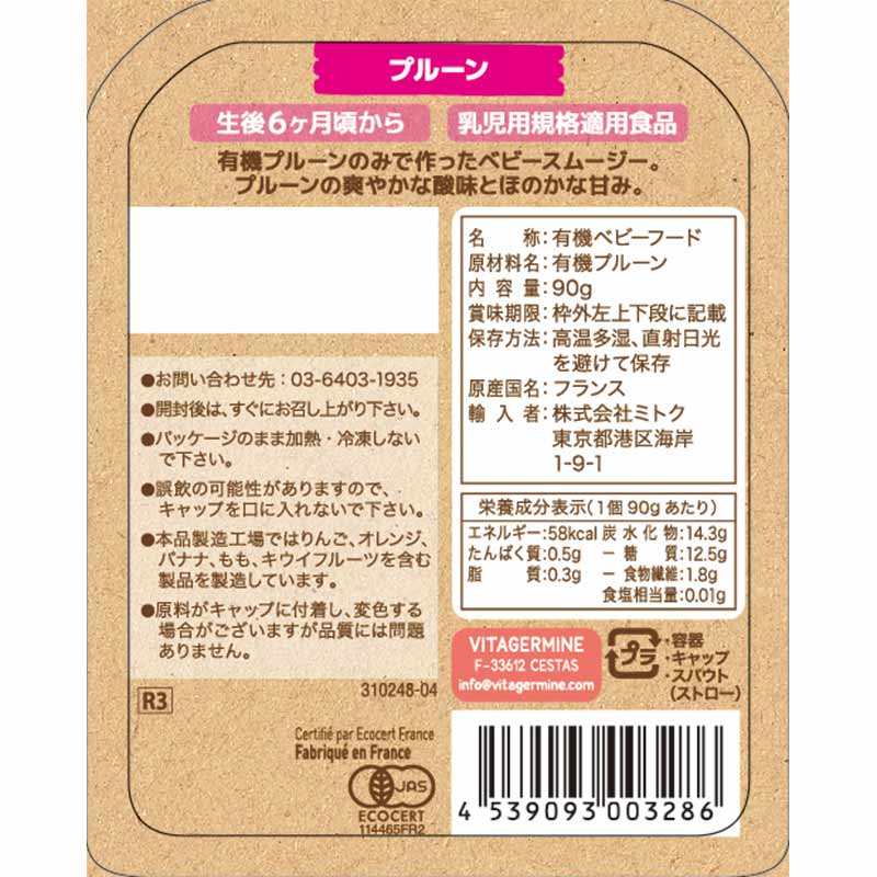 有機果実をすり潰したスムージータイプのベビーフードです。 程良い酸味とほのかに甘みのあるプルーンを100%使用しています。 生後6カ月頃よりお召し上がり頂けます。乳児用規格適用食品です。 開封後はすぐにお召し上がり下さい。 Babybio(ベビービオ)は、フランスで最初にオーガニック ベビーミルクを開発した ブランドです。 必要のない添加物は一切加えず、高品質の有機食材から作られた幼児向けの食品を提供しています。 フランスを中心に、近隣のヨーロッパ諸国で収穫した原材料を使用しています。 主原料のりんごは、フランス南西部アキテーヌ地方さんを使用しています。 この地方のりんごは、栽培に適した気候・地質に恵まれており、甘くジューシーでサクサクとした食感が楽しめます。 商品パッケージは、リサイクルが可能にするなど、環境に配慮した製品作りをおこなっています。