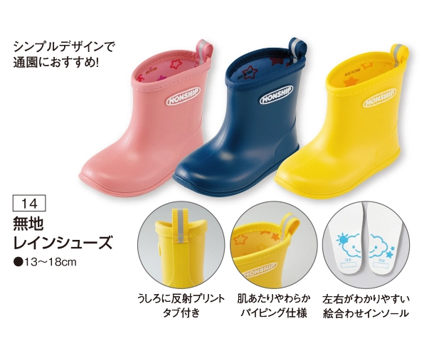 色がキレイなので、雨の日も楽しい気持ちになります。 裏地は星柄、靴底は星柄でかわいくてオシャレ。 デザインインソールなので、左右の履き間違えを防ぎます。 履き口がパイピング仕様で肌あたりが柔らかい。 反射プリント付タブ使用。夜間のライトを反射します