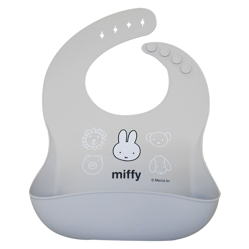 ミッフィーのシリコンエプロンが登場。 立体的なポケットが食べこぼしをしっかりキャッチ。 簡単に水洗い、拭き取り可能な扱いやすいシリコン素材のエプロンです。 ソフトな素材なので付け心地も良く、小さく丸めて持ち運びも出来ます。 首回りは4段階に調節可能。 (C)Mercis bv