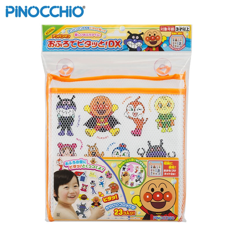 水を付けるとおふろの壁にピタッとくっつきます。 アンパンマンやばいきんまん等、人気の仲間たちが勢ぞろいのデザインです。 名前も書かれているので、覚えて楽しむこともできます。 収納に便利なおかたづけネット付き。 おかたづけネットも吸盤付きで、お風呂の壁にくっつけられます。 型はめ遊びもできます。