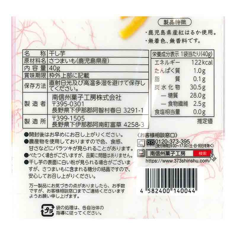 ●干し芋 ●原材料名:さつまいも(鹿児島県産) ●内容量:40g ●栄養成分:1袋当たり(40g) 熱量 122kcal たんぱく質 1.0g 脂質 0.1g 炭水化物 30.5g 食塩相当量 0.0g 糖質 28.0g 食物繊維 2.5g