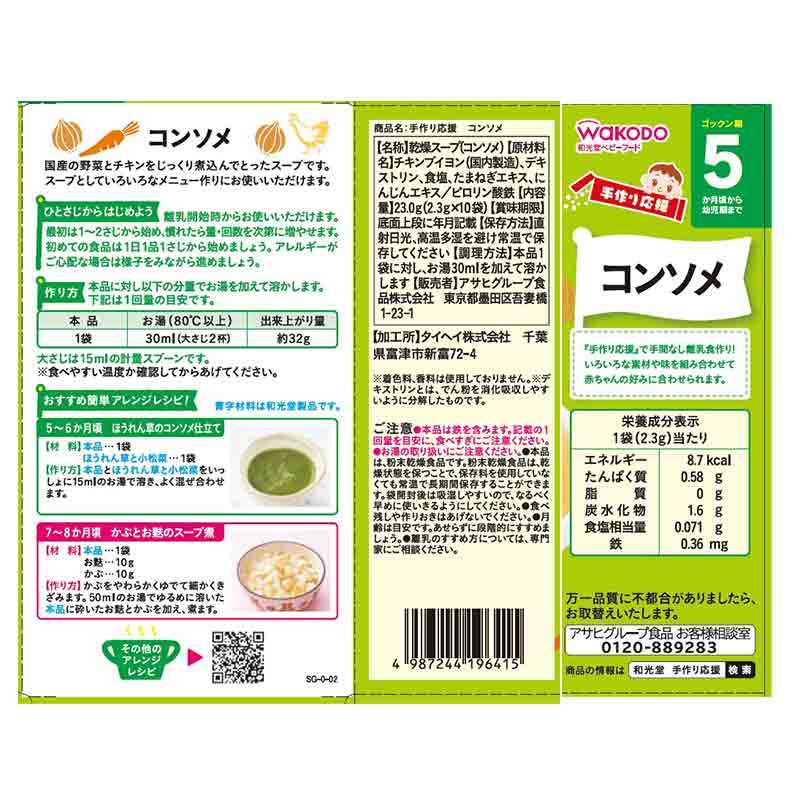 ●使用開始月齢:5ヵ月頃から ●原材料名:チキンブイヨン(国内製造)、デキストリン、食塩、たまねぎエキス、にんじんエキス/ピロリン酸鉄 ●内容量:23.0g(2.3g×10袋) ●栄養成分:単位重量 1袋(2.3g)当たり エネルギー 8.7kcal たんぱく質 0.58g 脂質 0g 炭水化物 1.6g 食塩相当量 0.071g 鉄 0.36mg