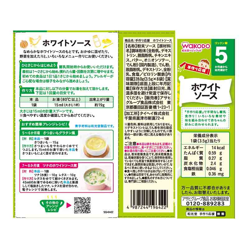 なめらかなホワイトソースのもとです。 おかゆに混ぜたり、野菜を加えたりと、いろいろなメニュー作りにお使いください。 離乳食作りに欠かせない調味シリーズ。 素材を活かしたやさしい味付けで、メニューのバリエーションが広がります。 不足しがちな鉄をサポート。