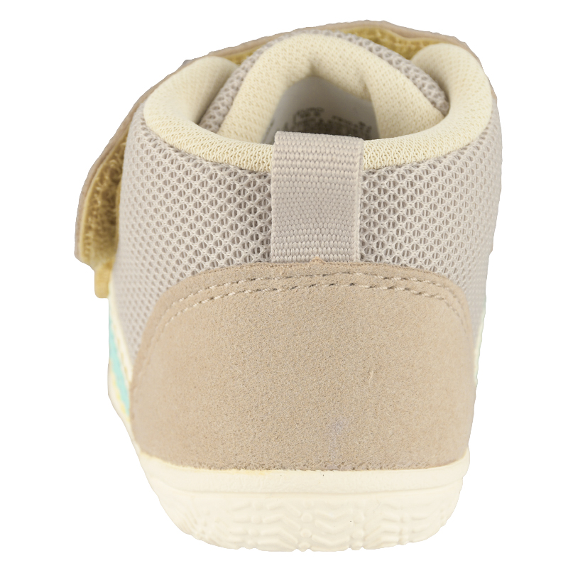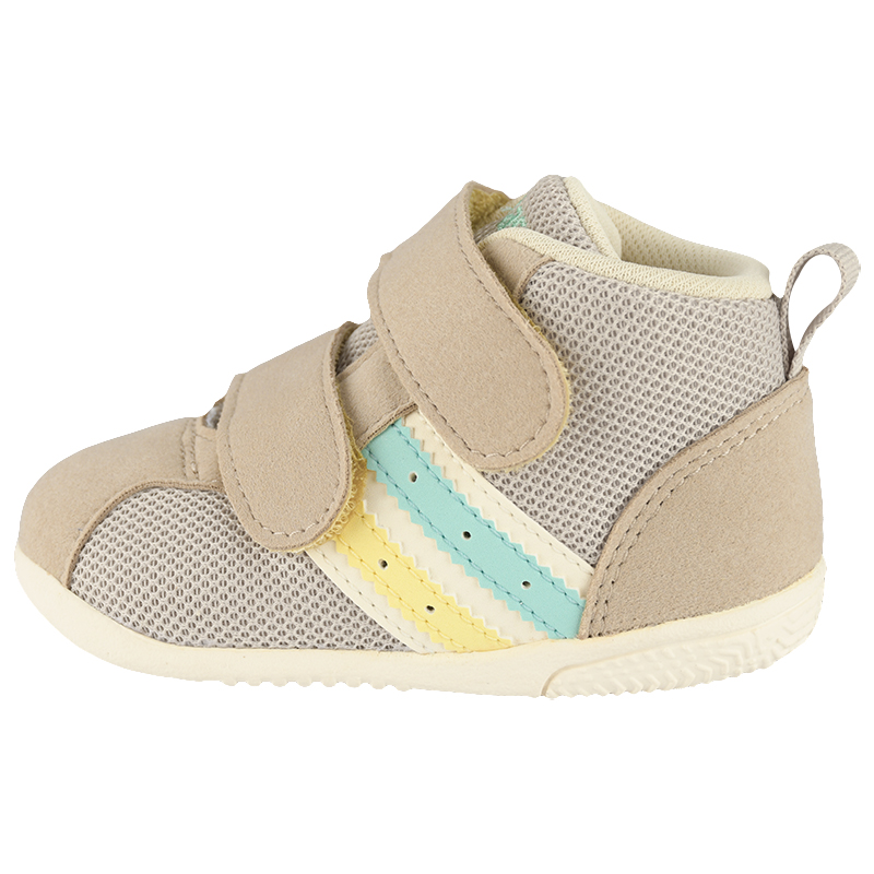 歩きはじめの約3カ月間の赤ちゃん向けに展開するFIRSTシリーズのキッズシューズ。つま先を大きく巻き上げる形状でつまずきにくくし、スムーズな歩行をサポートします。さらに靴底全体のエッジを丸くすることで、ぐらつきやすい赤ちゃんの歩行で起こりがちなひっかかりも軽減。フィット感の調節がしやすい2本ベルトで、履き口が大きく開くため脱ぎ履きもしやすいです。ウエアとコーディネートしやすい、愛らしいカラーリングです。