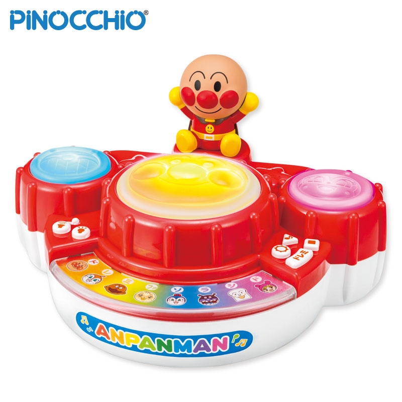 叩くと光って音がなる、小さなお子様にも楽しめるボンゴです。 打面は3か所発光。前面に、触るだけで音が鳴る不思議な「ドレミファタッチパネル」が付いています。 触るだけでドレミの演奏ができたり、8人の仲間たちのおしゃべりも楽しめます。 「アンパンマンのマーチ」「勇気りんりん」を含むメロディ20曲を収録しています。