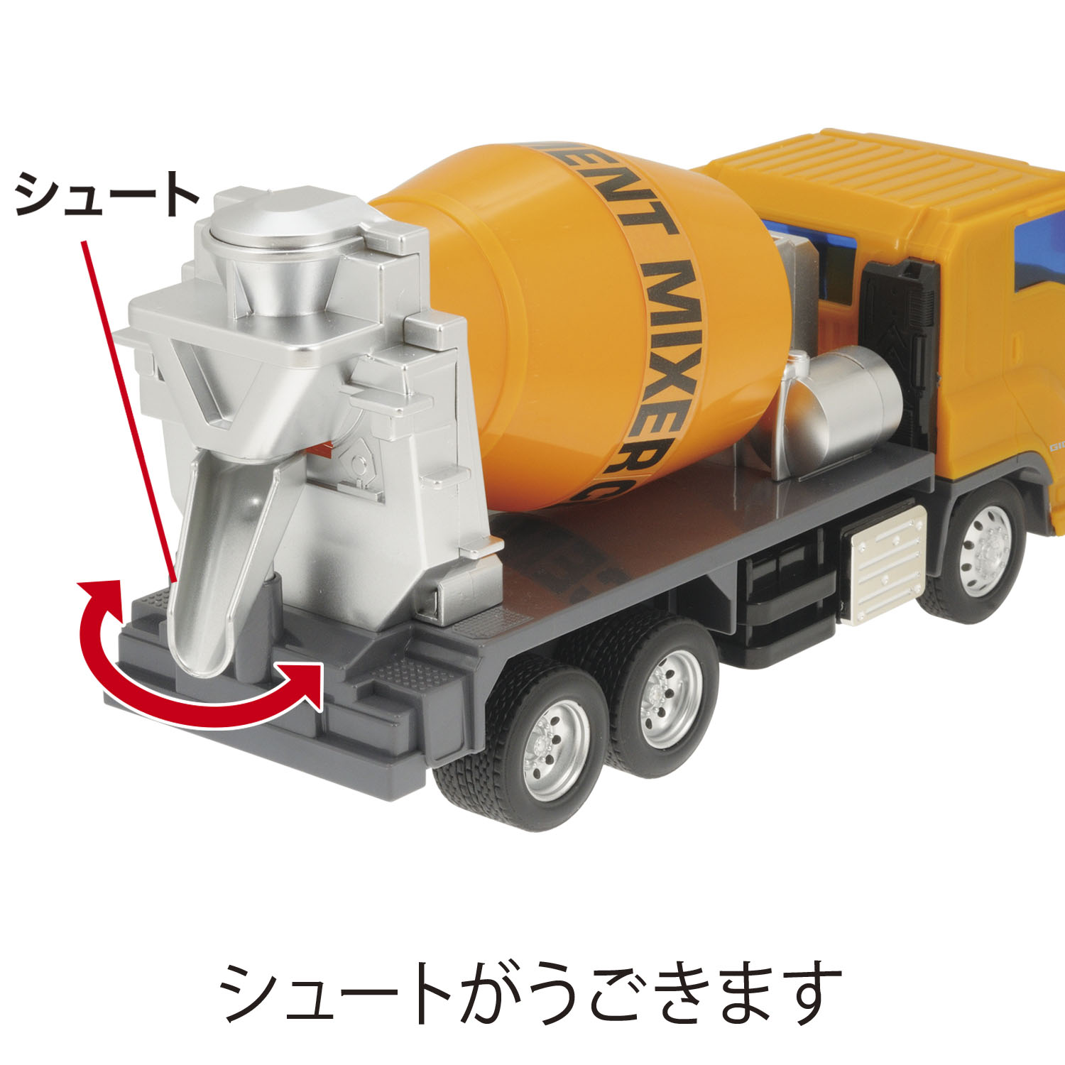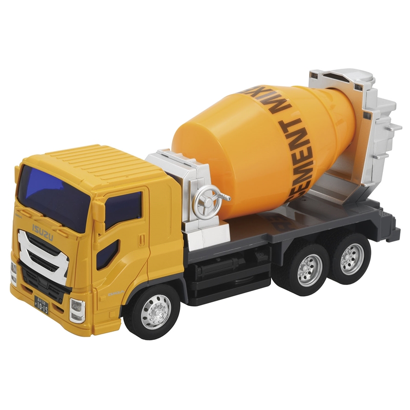 リアルなフォルムでイスズギガのライセンスを取得しています。 ハンドルを回すとミキサー車のドラムが回転します。 後ろのシュートが動きます。 フリクション機構内蔵しており前輪を床に押し付けながら前へスライドさせ勢いをつけ、 手を離すと前へ進みます。 玩具安全基準合格 ST ・フリクション内蔵 ・ハンドルを回すとドラムが回ります。