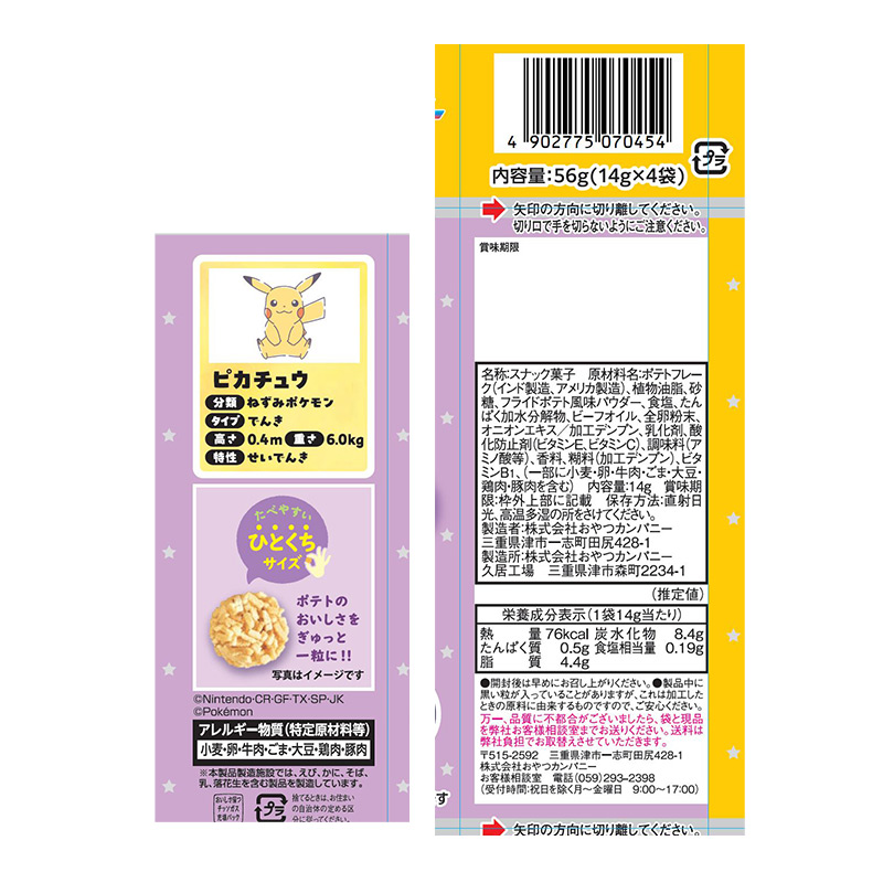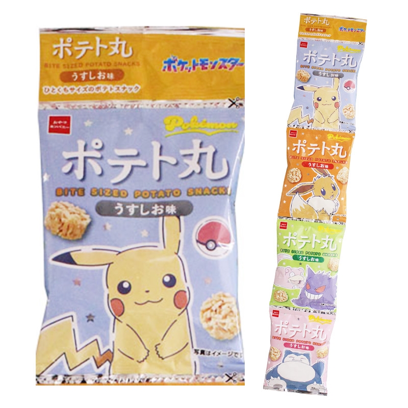 『ポケットモンスター』とコラボした、ころころかわいいひとくちサイズのポテトスナック ポテト丸。 カリッサクッとした独特の食感で、ポテトの美味しさが広がります。 食べきりサイズが4つ連なって、買い置きにも便利です。 ※パッケージデザインが、画像と異なる場合がございます。
