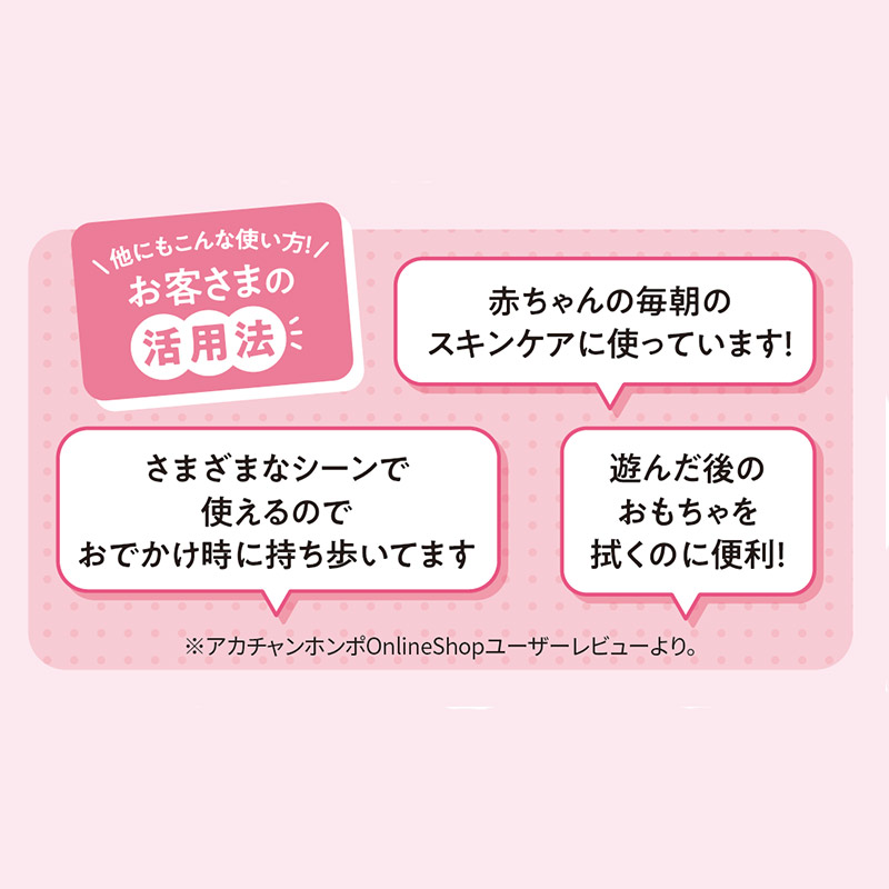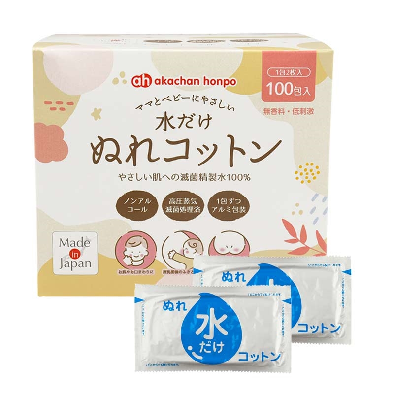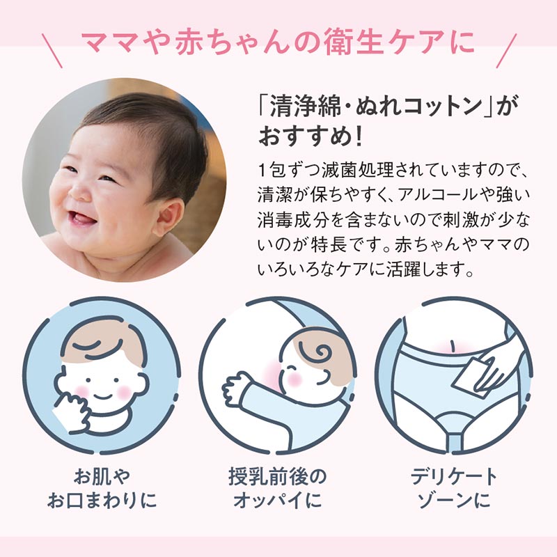 ママと赤ちゃんの為にやさしさにこだわった、ウェットコットン。 滅菌精製水(パイロジェンフリー水)とコットンだけを使用しています。 高圧蒸気滅菌処理済み。 1包ずつアルミ個包装。 お肌やお口まわりに。 授乳前後のふきとりに。 デリケートゾーンに。