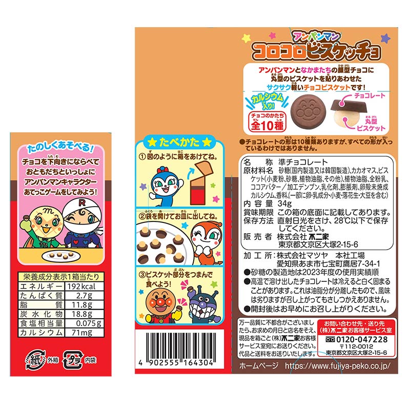 ●準チョコレート ●原材料名:砂糖(国内製造又は韓国製造)、カカオマス、ビスケット(小麦粉、砂糖、植物油脂、その他)、植物油脂、全粉乳、ココアバター/加工デンプン、乳化剤、膨脹剤、卵殻未焼成カルシウム、香料、(一部に卵・乳成分・小麦・落花生・大豆を含む) ●内容量:34g ●栄養成分:その他(1箱当たり) 熱量 192kcal たんぱく質 2.7g 脂質 11.8g 炭水化物 18.8g 食塩相当量 0.075g カルシウム 71mg