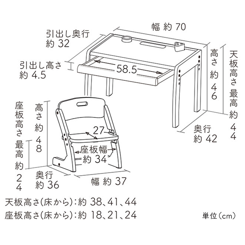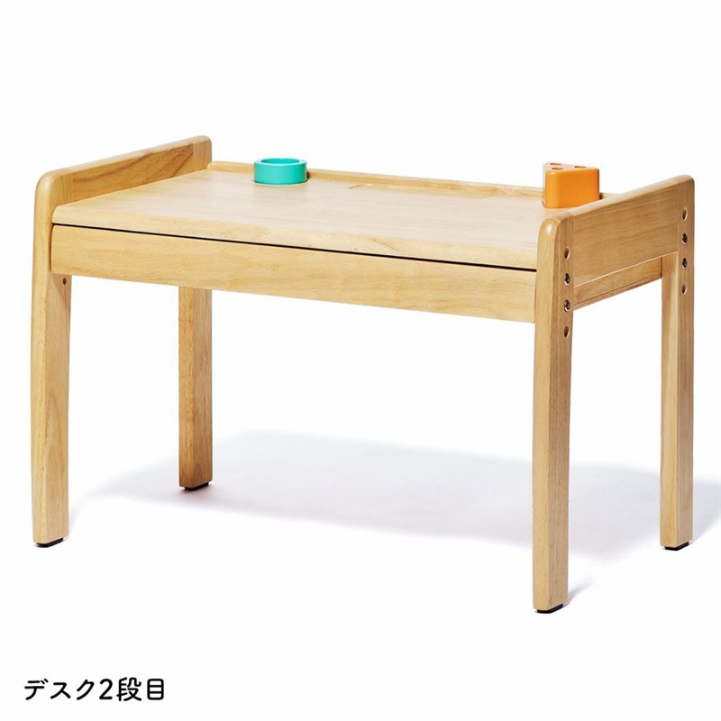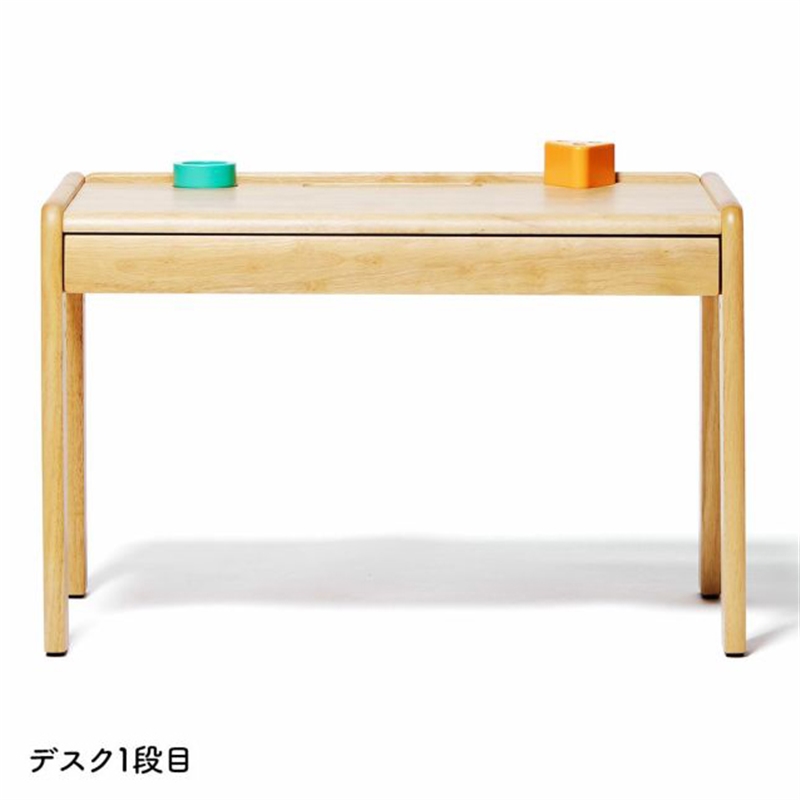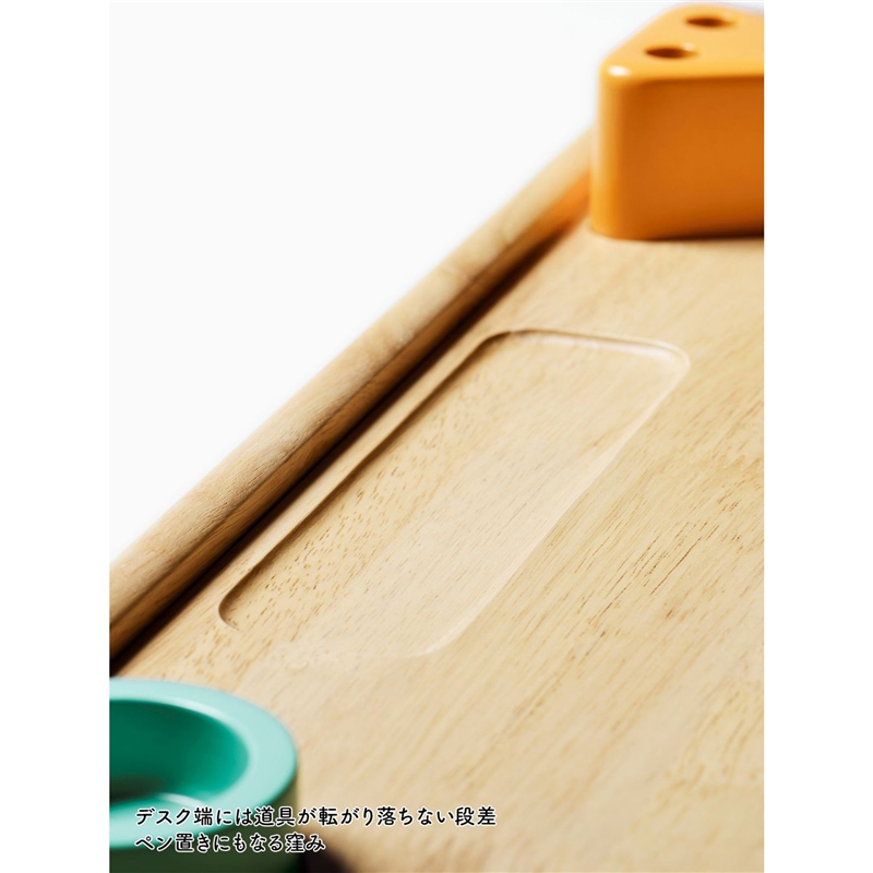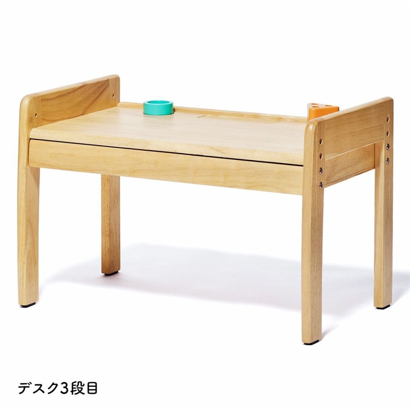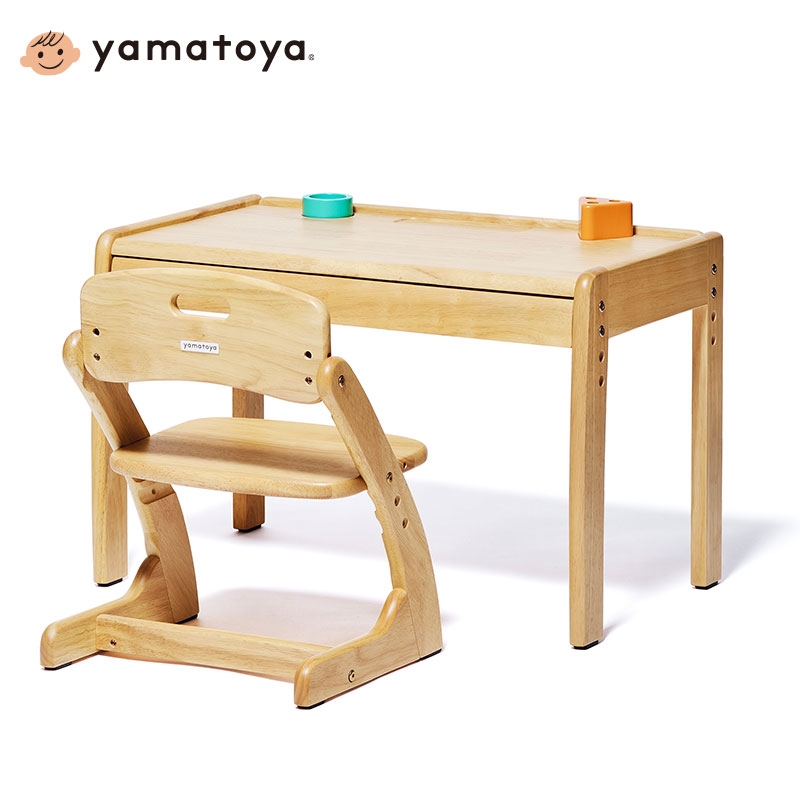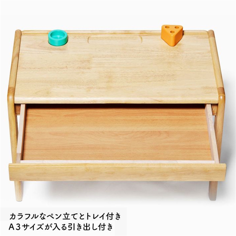 成長に合わせて高さが変えられるデスクとチェアのセット。 デスク天板とチェア座板の高さはそれぞれ3段階調整できます。 また、チェアの背板の高さも成長に合わせて2段階調整可能。 デスクはA3サイズが入る大きな引き出し付きで、スケッチブックやクレヨンなどを収納することができます。 デスクの端には段差があり道具が転がり落ちることを防いでくれます。小物入れとペン立て付きです。 できるを、応援。する使いやすい仕様です。