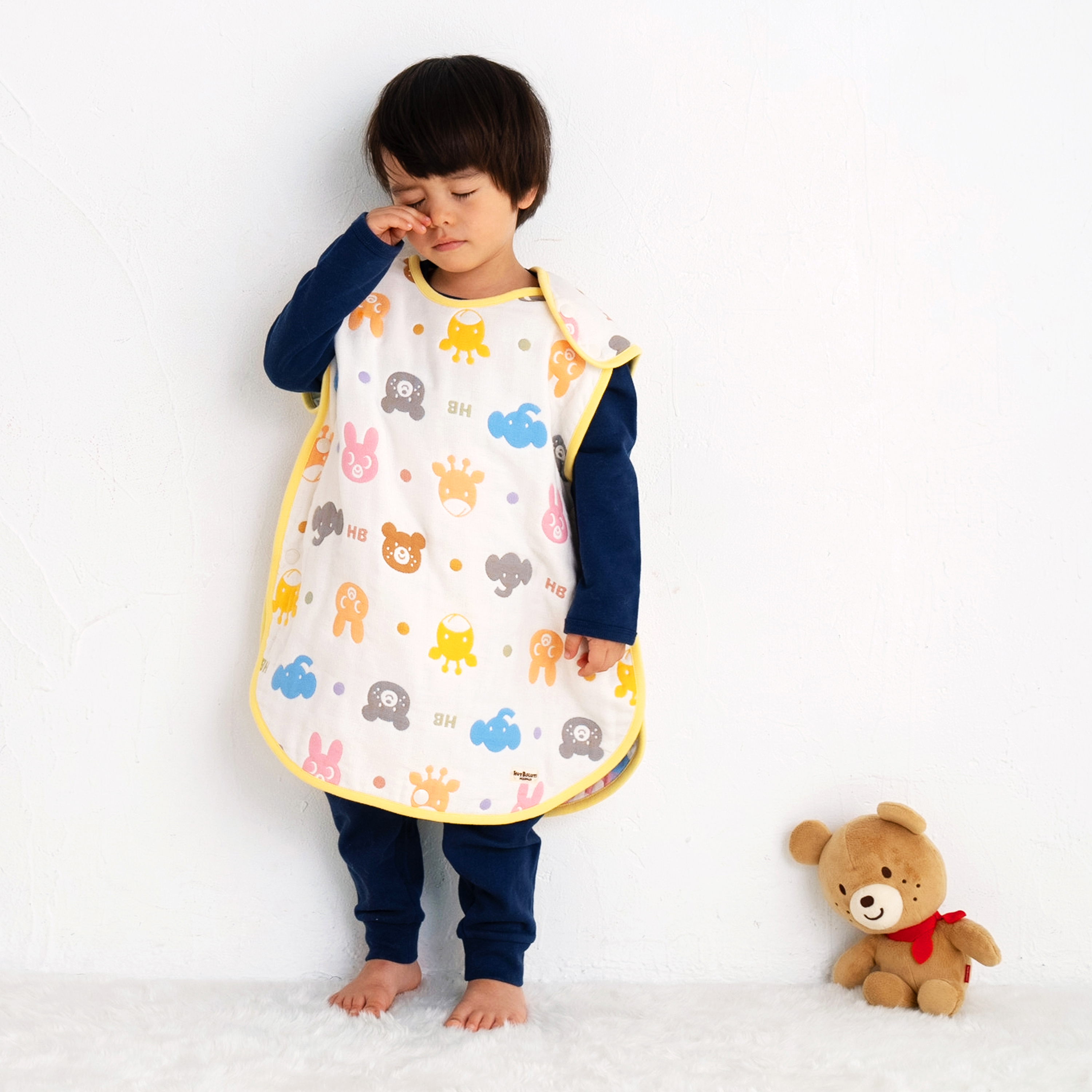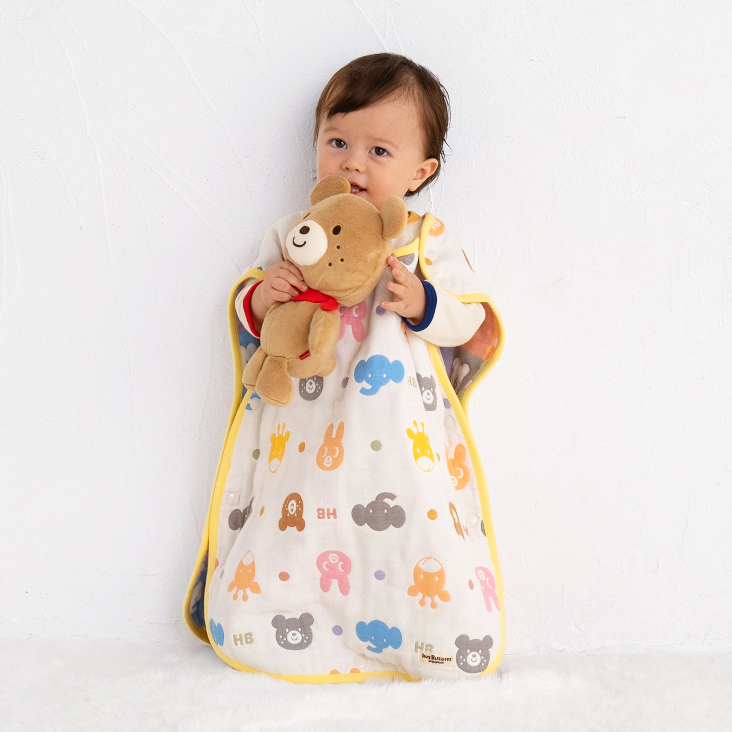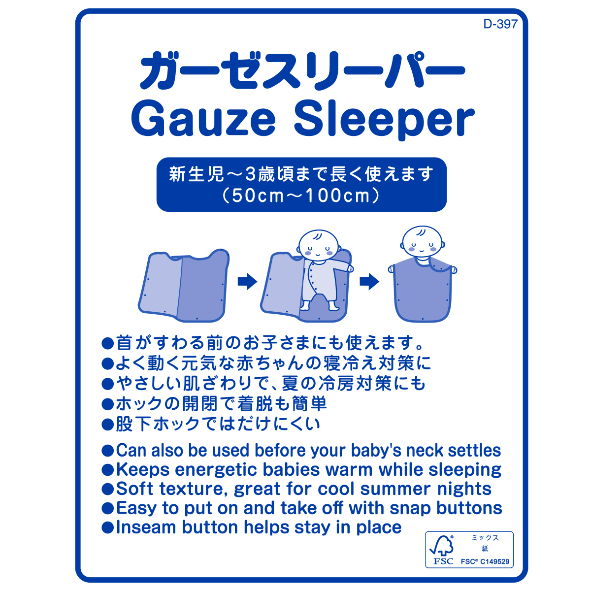 六重織ガーゼを使用したかわいい総柄のスリーパーです。 やわらかく、ふっくらとした肌触りでやさしい風合いが特徴のガーゼを使用しています。 通気性・吸水性・速乾性に優れているので、汗っかきの赤ちゃんにとても便利です。 寒い時期はあたたまった空気を包み込んで逃がさず保温するので、驚くほど暖か★ 通年使える素材でギフトにもおすすめです。 ・首がすわる前のお子さまにも使えます。 ・よく動く元気な赤ちゃんの寝冷え対策に。 ・やさしい肌触りのガーゼで、夏の冷房対策にも。 ・通気性・吸水速乾性にも優れています。 ・肩開きスナップボタンで着脱も簡単。 ・動いても足元が冷えないように、真ん中にスナップボタン付き。 ・新生児から3歳頃まで長く使えます。