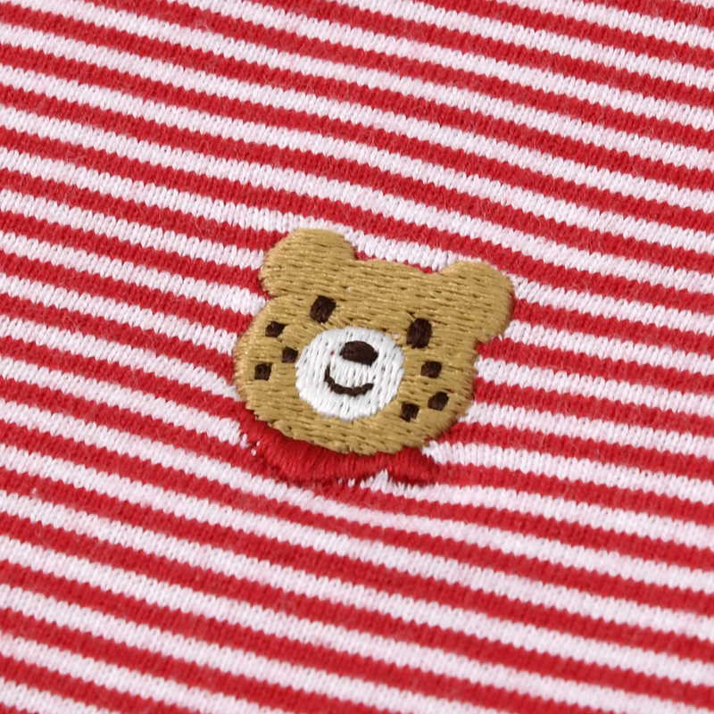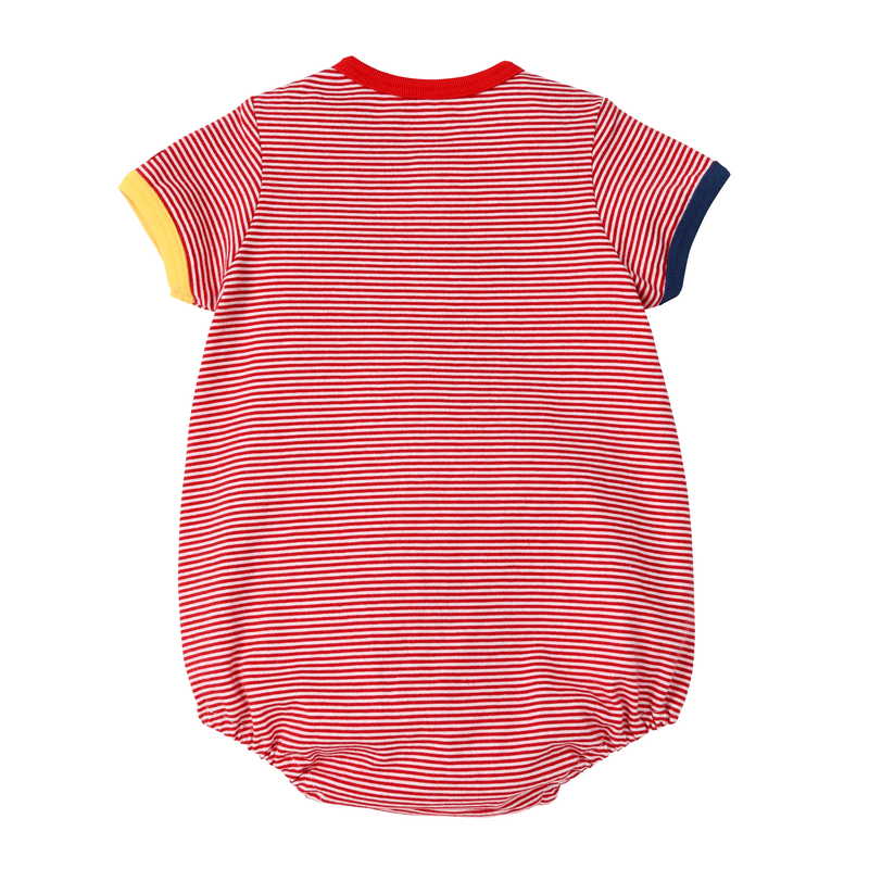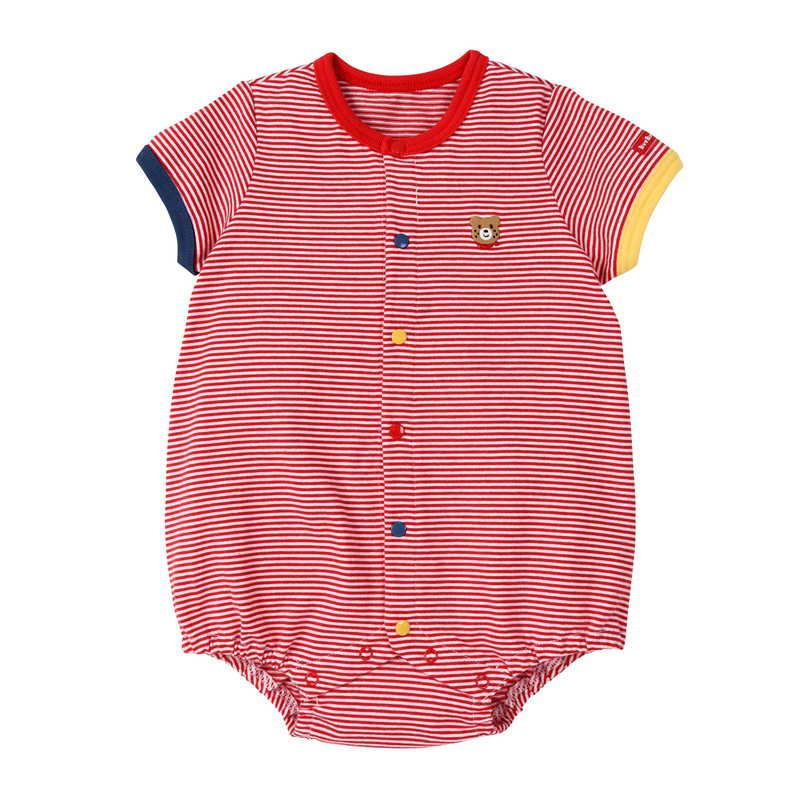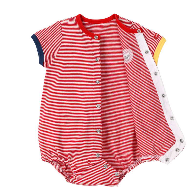 前開き・ボーダー柄の半袖ロンパース(ボディシャツ)です。 インナー(肌着)としても、アウター(赤ちゃんの半袖Tシャツ)としても お使いいただけます。 カラフルなスナップボタンがアクセントになっていて、お洋服としても可愛らしいデザイン。 ジャンパースカートやオーバーオールとのコーディネートオススメです。