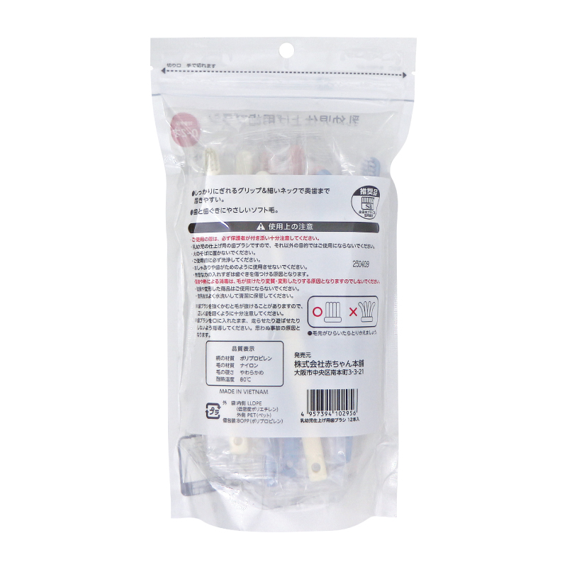 リーズナブルさとシンプルさ、コンパクトさを追求した0~2歳向けの乳幼児仕上げ用歯ブラシです。 口を大きく開けてくれないというお子様でも奥歯まで届きやすいコンパクトなブラシヘッドです。 うれしい12本入り。パパとママが磨いてあげる歯ブラシで楽しい歯みがき習慣をつけましょう。 ※リニューアルのため、歯ブラシの柄の色が画像と異なる場合がございます。あらかじめご了承ください。