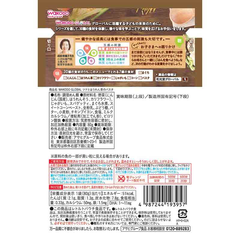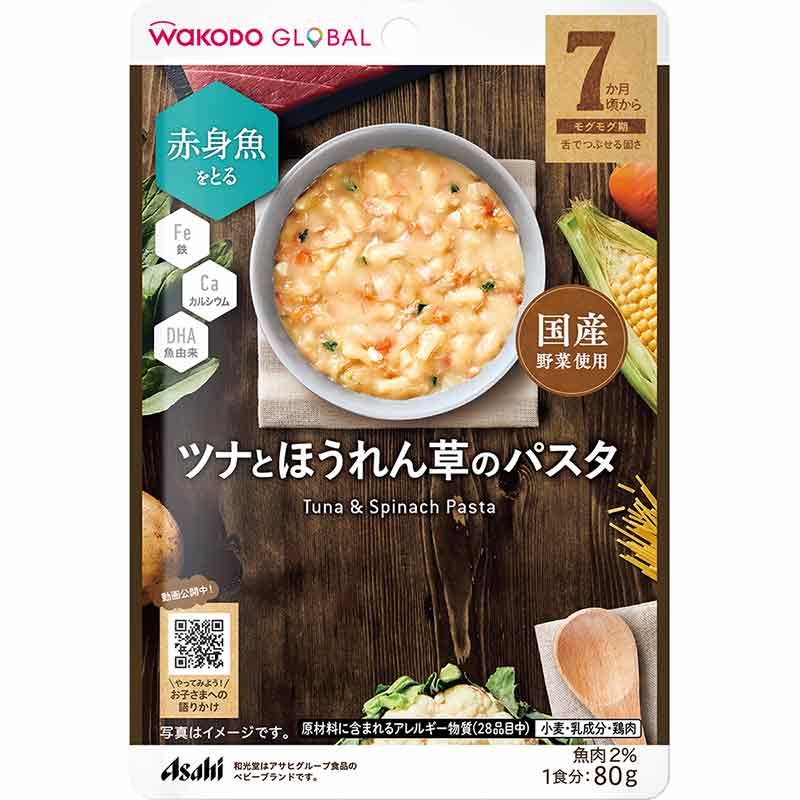 ●使用開始月齢:7ヵ月頃から ●原材料名:野菜(にんじん(国産)、ほうれんそう、カリフラワー)、じゃがいも、スパゲッティ、まぐろ水煮、スイートコーンペースト、全粉乳、ぶどう糖、バター、小麦粉、チキンブイヨン、食塩、ミルクカルシウム/増粘剤(加工でん粉)、ピロリン酸鉄 ●内容量:80g ●栄養成分:単位重量 1袋(80g)当たり エネルギー 51kcal たんぱく質 2.1g 脂質 1.3g 炭水化物 7.8g 食塩相当量 0.33g カルシウム 50mg 鉄 1.5mg DHA 1~11mg