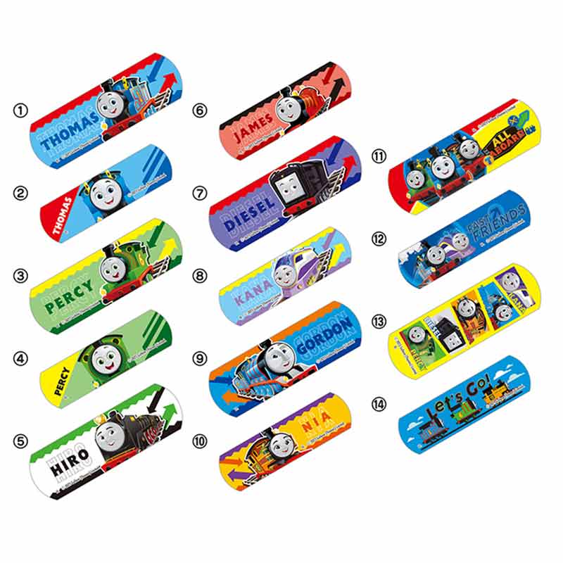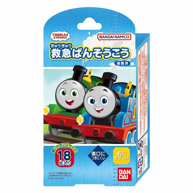 きかんしゃトーマスのばんそうこうです。 ジュニアサイズのばんそうこう18枚入りです。 絵柄は全部で14種類あります。 14種類全て揃わない場合があります。 はがすときにやさしいソフトな粘着力です。 傷つきにくいパッドとなっております。 通気性を高める微細な穴加工テープです。 (C) Gullane (Thomas) Limited.