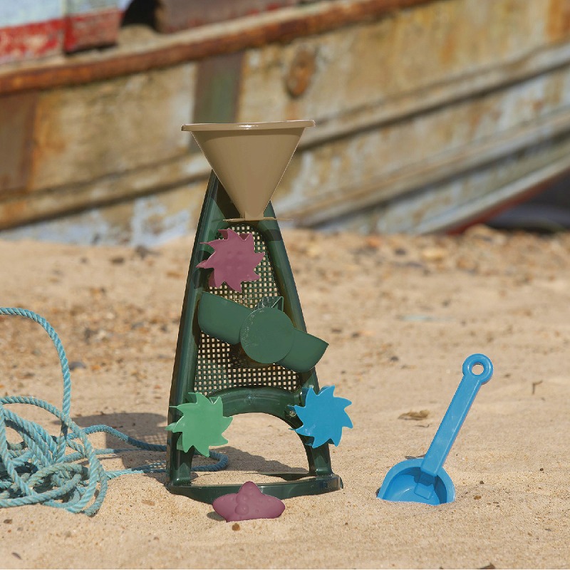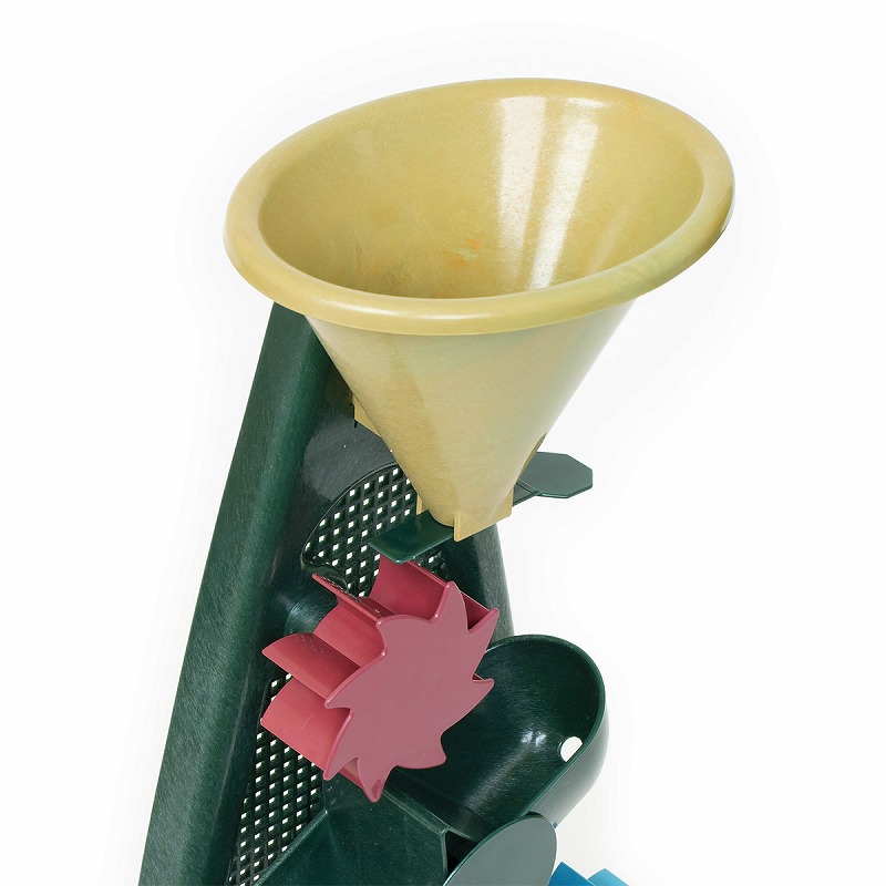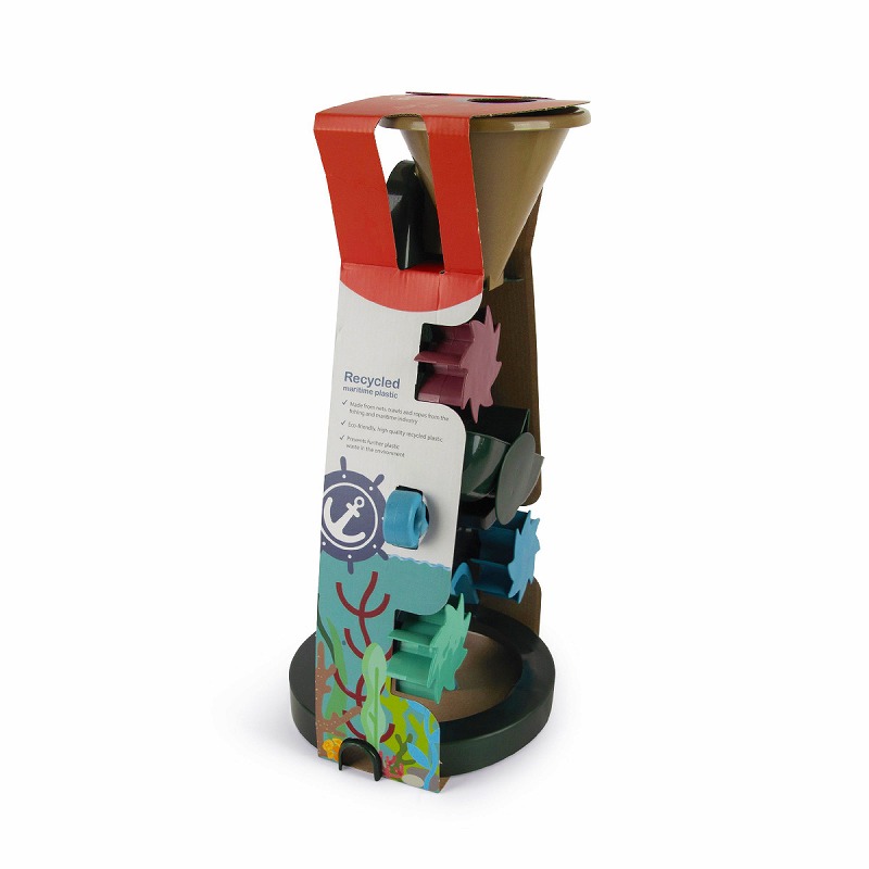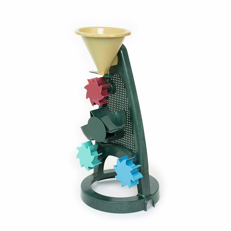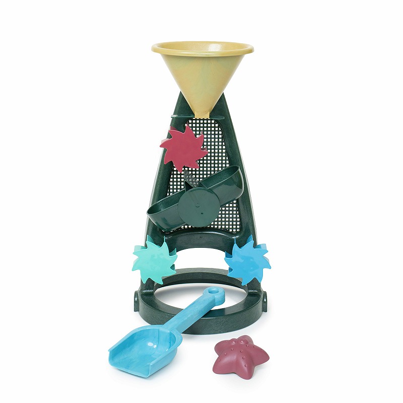 上から水を流すだけのシンプルな操作で、低年齢でも遊べます。 水の量が多いと早く流れ、少ないとゆっくり、高いところから落ちると勢いがつくなど水の不思議を満喫できます。 水が落ちると3つの水車がくるくると回り、真ん中のシーソーに水が溜まって左右に動きます。 『Blue Marine ビーチあそびセット』のバケツにぴったりはめることができ、あわせてあそびが広がります。 〈Blue Marineシリーズ〉 廃棄されるものや海で回収された漁具(網・ロープ・浮きなど)から製造された『リサイクルプラスチック』素材。 2050年には、海を漂うゴミの量が泳ぐ魚の量を上回り、水質汚染・マイクロプラスチック・海洋生物への影響など、様々な問題に関わるといわれています。 回収されるネットは青や緑のものが多く、カラーリングは海や砂、サンゴをイメージしています。